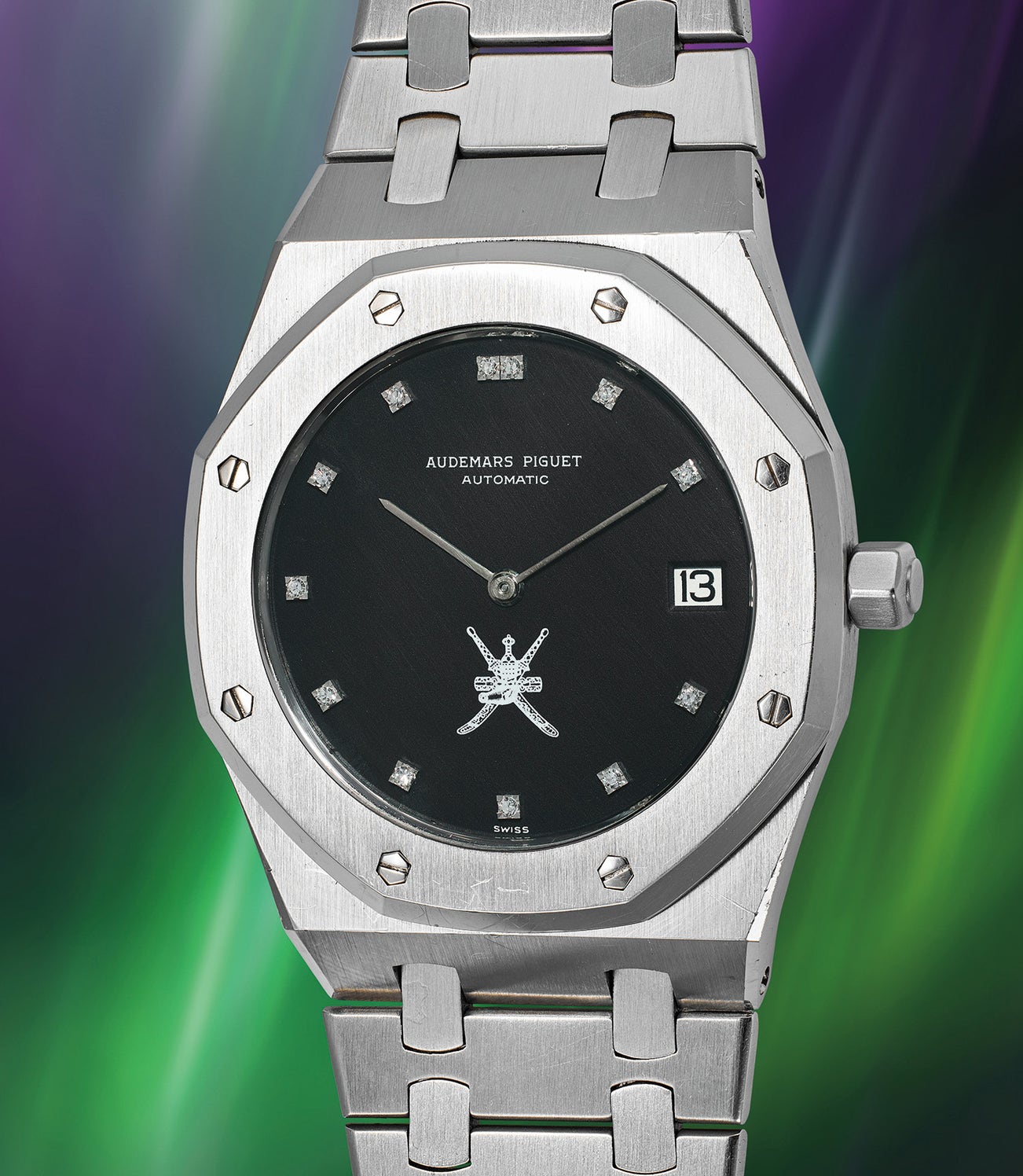 Distinguished by its black dial, devoid of the customary tapisserie motif but embellished with refined diamond markers and prominently displaying the royal "Khanjar" daggers at 6 o’clock, the present reference 5402 stands apart from regular production models. Records indicate that in the spring of 1973, Audemars Piguet ordered a batch of six dials without the tapisserie motif, featuring diamond-set indexes and an emblem at 6 o'clock. His Majesty Sultan Qaboos bin Said al Said of Oman, well known as an avid collector and aficionado of horology, frequently commissioned timepieces from esteemed manufactures to bestow upon loyal friends and foreign dignitaries. Assuming the throne on July 23, 1970, this makes the present watch likely one of the earliest gifts bestowed during his reign.