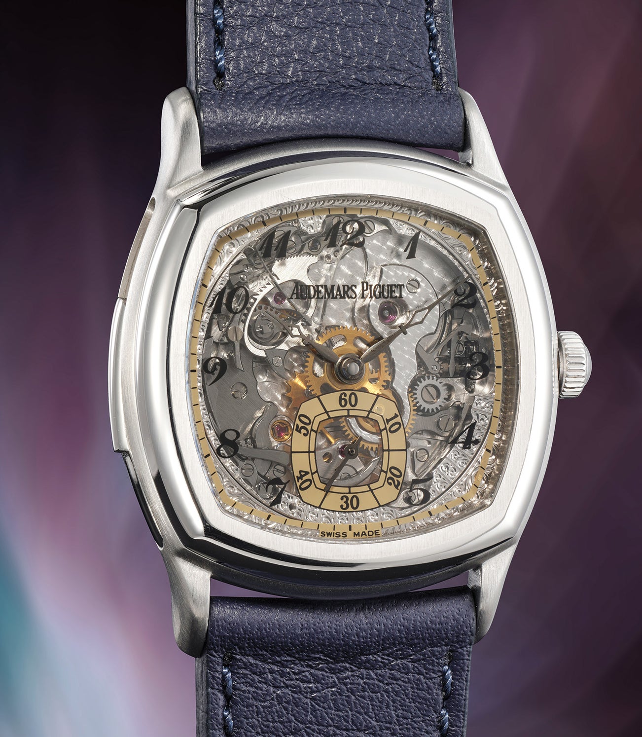 In the 1990s, Audemars Piguet launched a special cushion shaped collection under the moniker of the John Shaeffer Collection - this was created as a response to the success of the original John Shaeffer model exhibited during the Audemars Piguet museum opening in 1992. The present watch is housed in a platinum-shaped case very similar in style to the original Shaeffer watch. It chimes with great tone and clarity. This example notably features a beautifully constructed open worked skeletonized dial and movement that is decorated to perfection. Research shows that 45 examples of the reference were made during the production period.