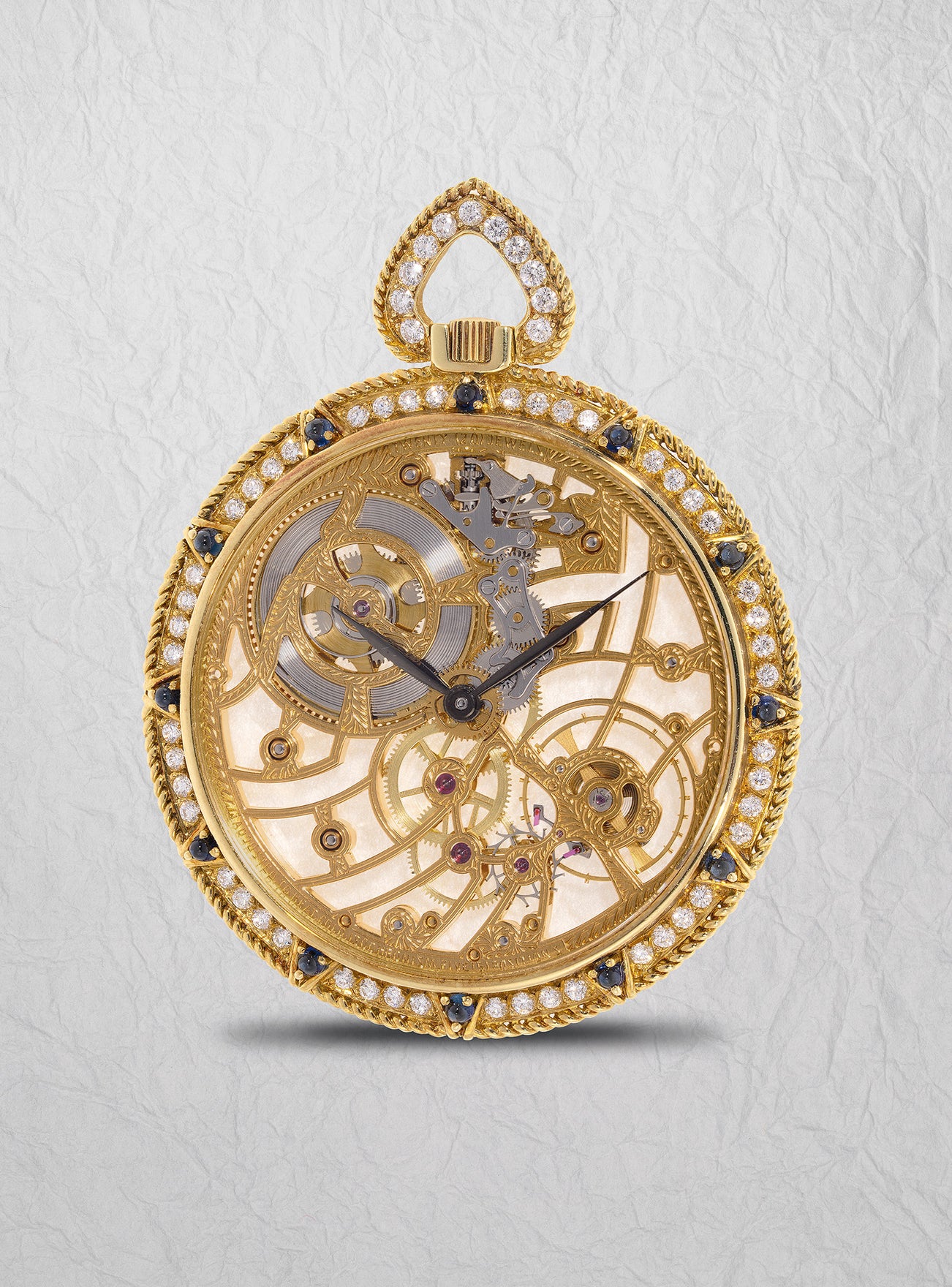 An elegante and impressive sapphire and diamond-set yellow gold skeletonized open-faced keyless pocket watch with guarantee and presentation box