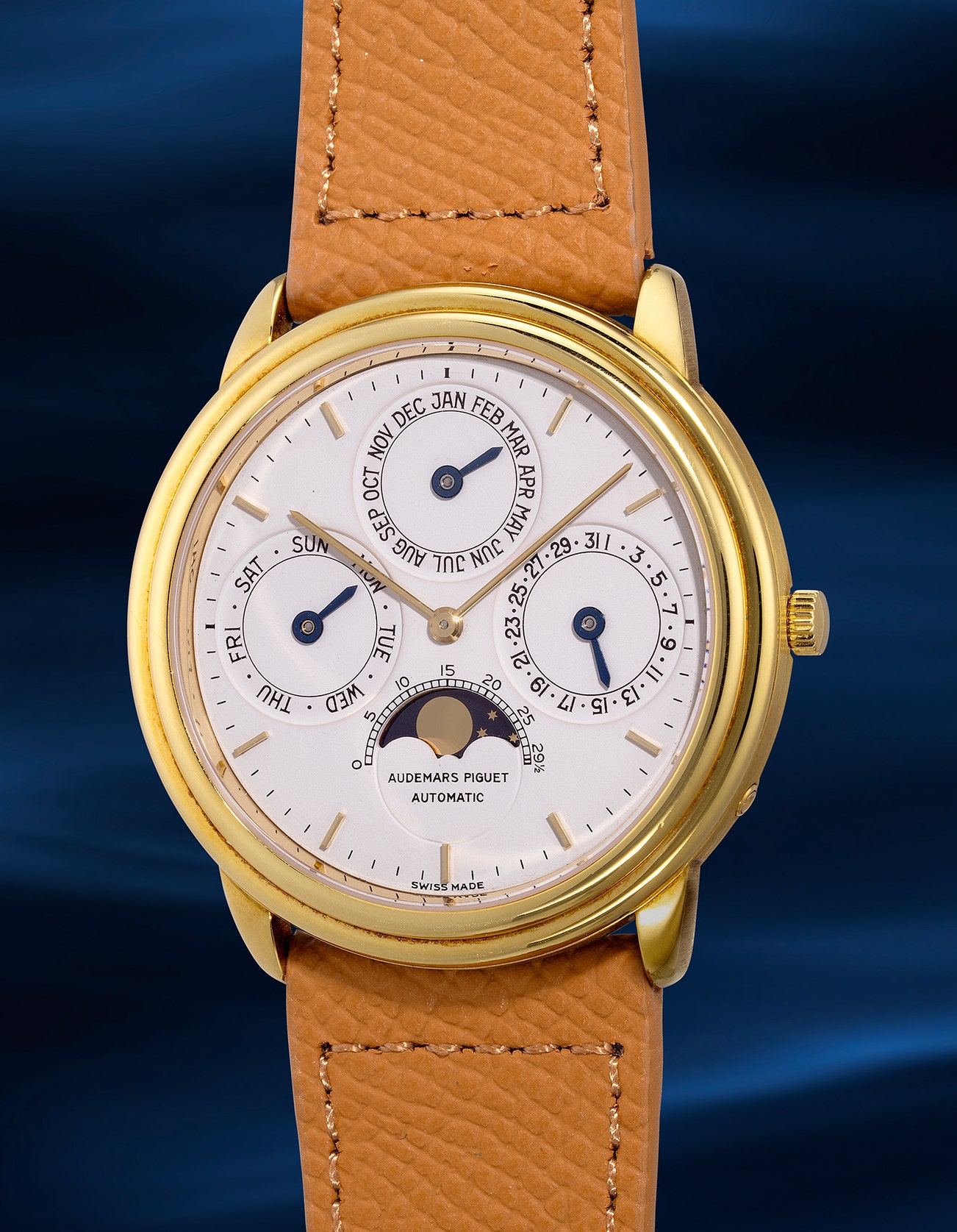 - The restrained "Audemars Piguet" font exudes vintage allure, which later models lack. Recessed subdials create depth and mesmerizing light effects, hinting at the dial's Stern Créations origins - also supplier to Patek Philippe and Rolex.