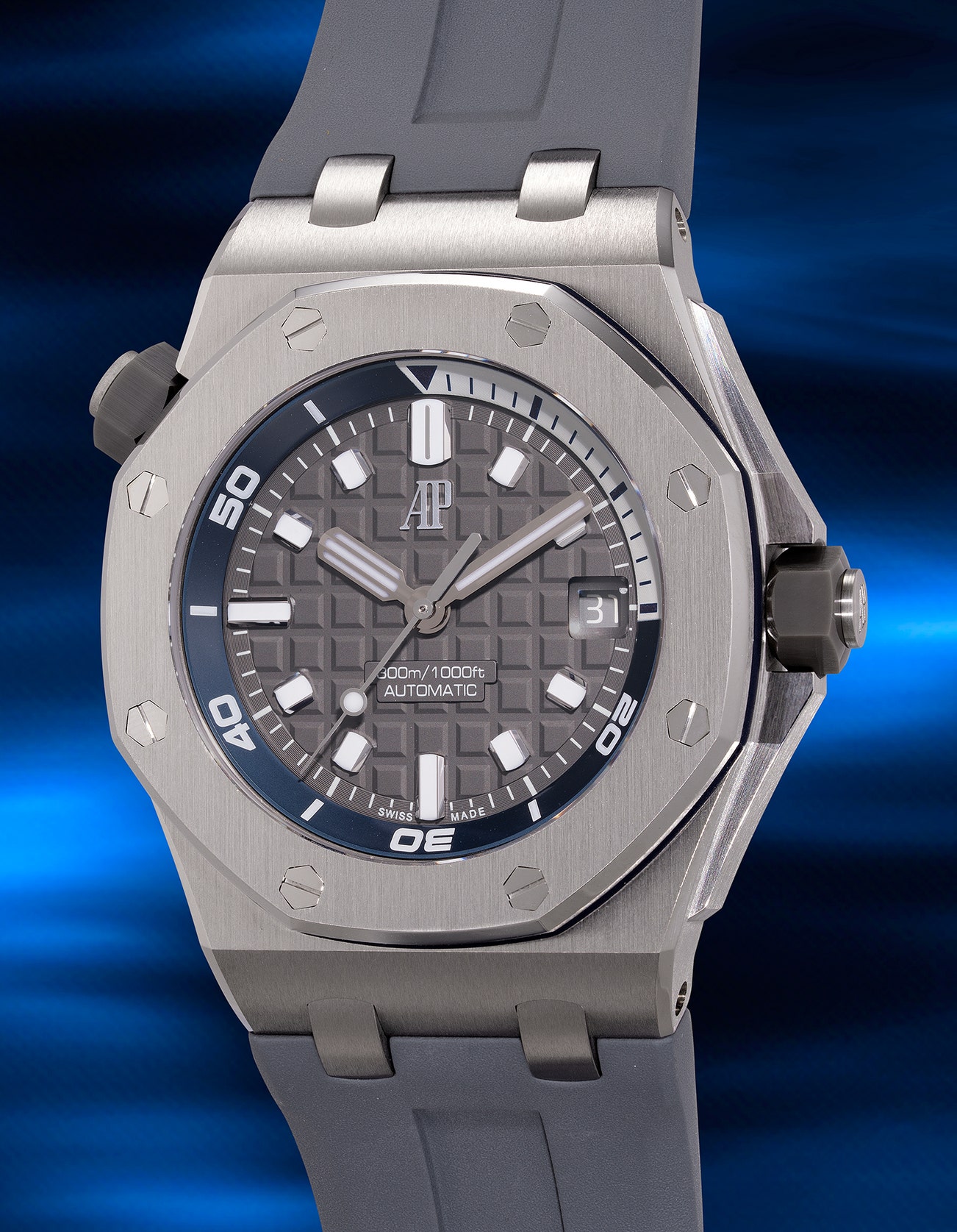 - Released in 2021, the present Offshore Diver’s grey “Mega Tapisserie” guilloche dial and hands glow with a spectral blue luminosity, illuminated for legibility even on the midnight watch. Beneath the bonnet ticks Audemars Piguet’s upgraded self-winding cal. 4308 movement for improved accuracy.
