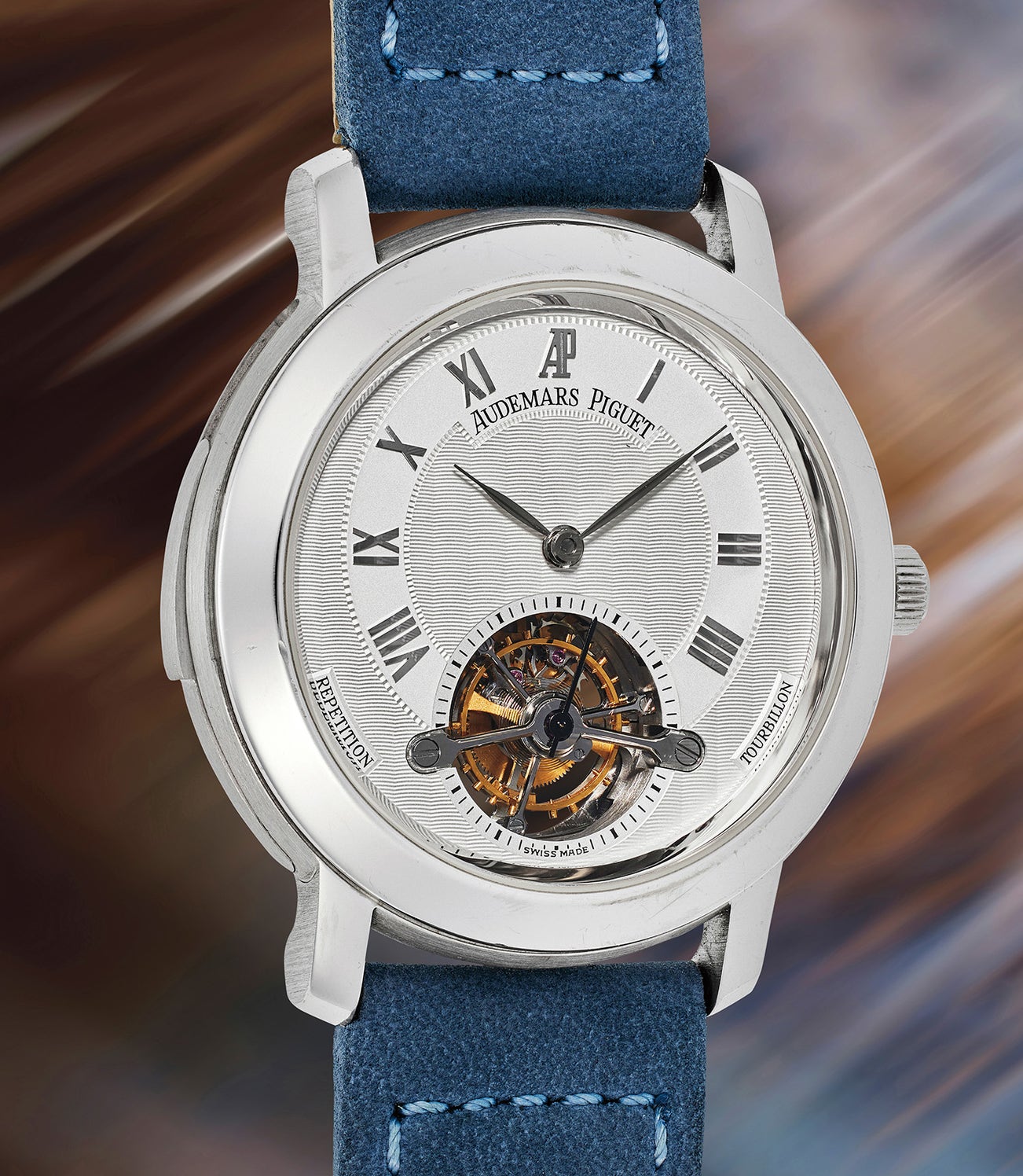 The present example beautifully exemplifies how the brand manages to interpret its distinguished heritage in light of the modern evolution of watchmaking design. It features the two arguably most sought-after horological complications - the tourbillon and the minute repeater - housed in an exquisitely retro-modern Jules Audemars case, inspired by the classic cases of the mid-twentieth century but reinterpreted in a modern aesthetic. The dial design is simple but full of character, the exposed tourbillon being the undoubted protagonist, subtly complemented by the guillochage and the asymmetric chapter ring for the hours.