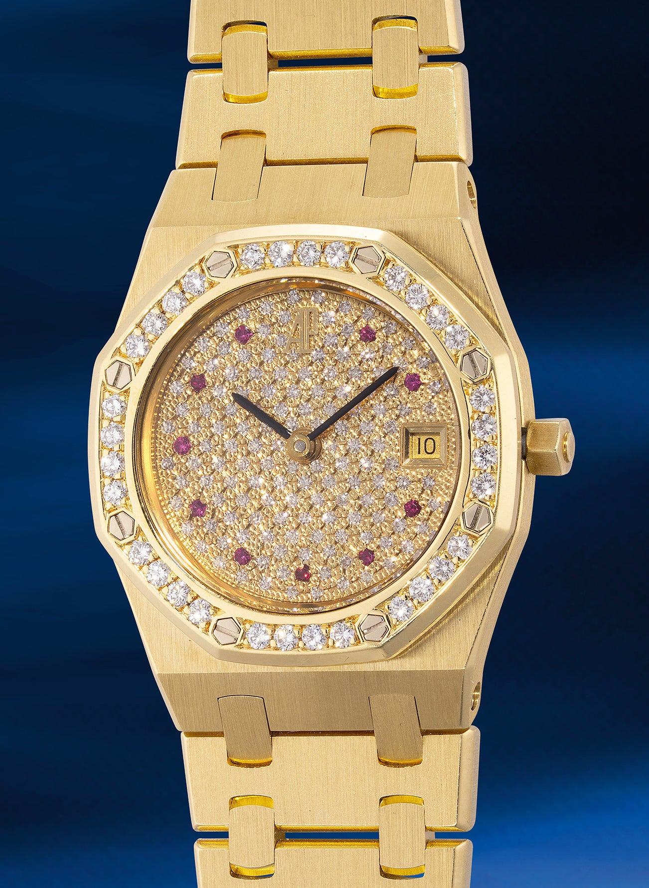 A lady’s fine, well-preserved and rare yellow gold and diamond-set quartz wristwatch with pavé diamond-set dial, ruby-set indexes, date, bracelet, certificate and presentation box