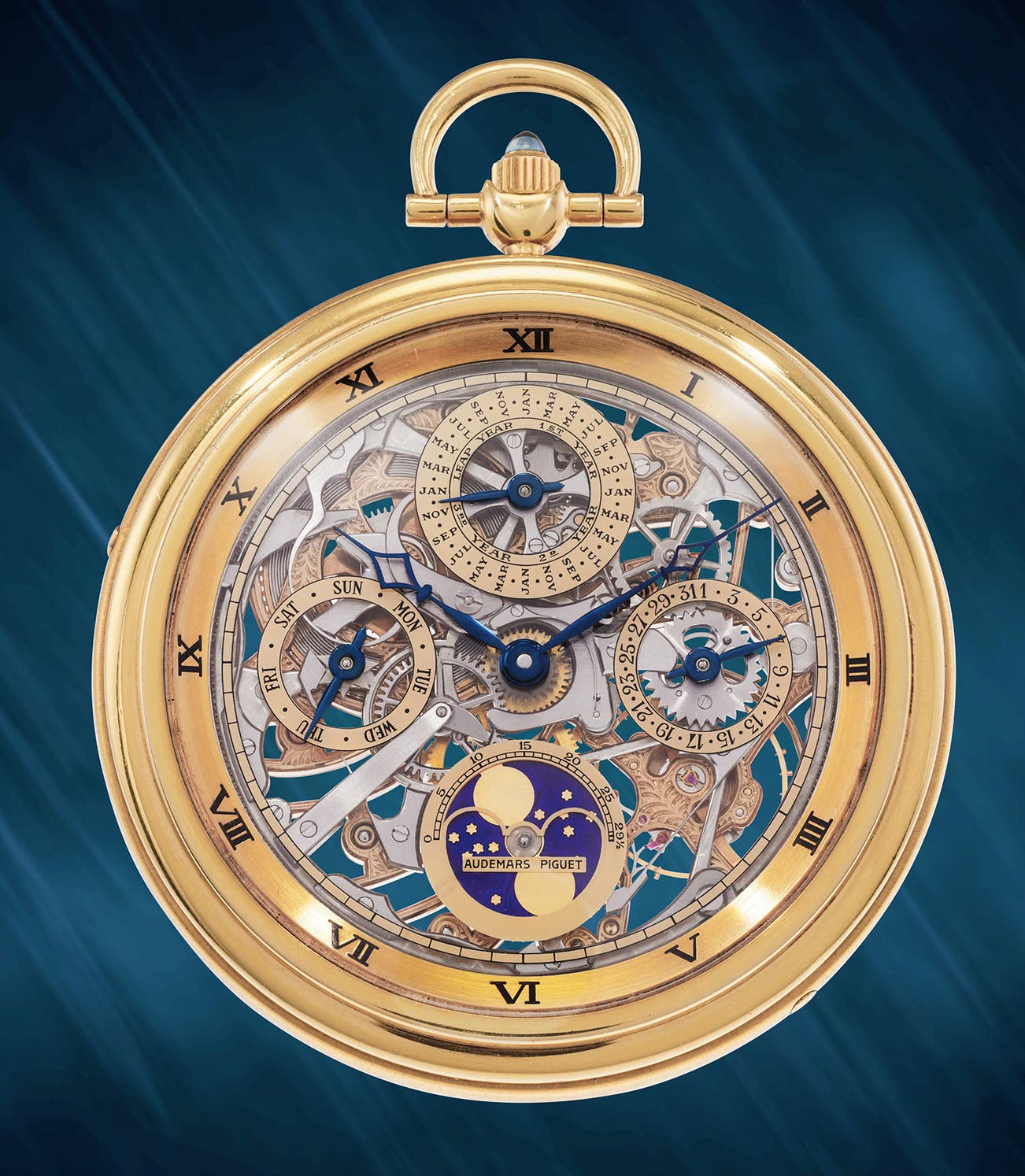 A fine and attractive yellow gold skeletonized perpetual calendar open face pocket watch with moon phases and leap year indication
