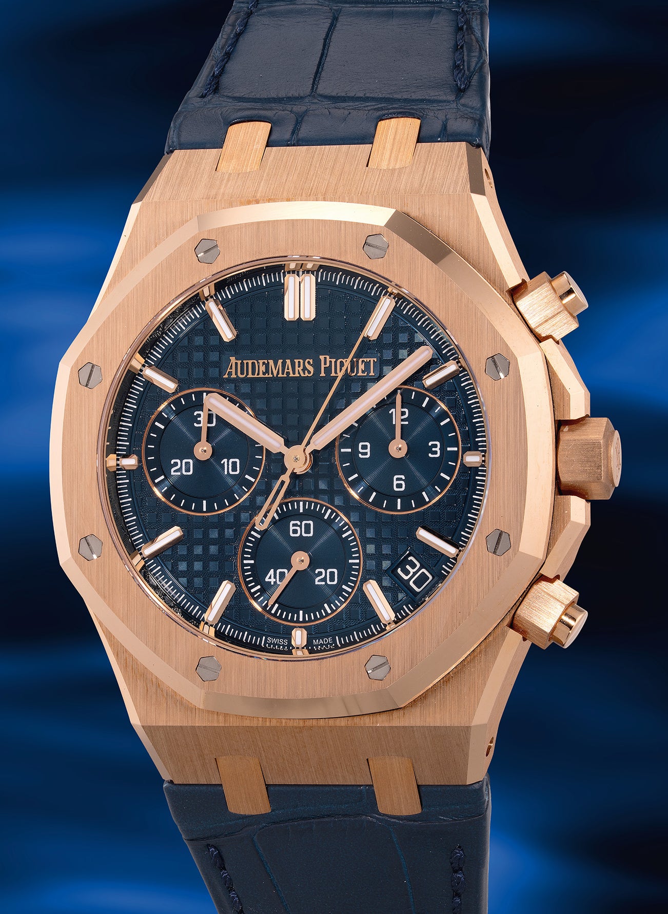 This special edition features the reintroduction of the iconic "Bleu Nuit, Nuage 50" dial color, inspired by the original 1972 Royal Oak. Rendered in the signature Grande Tapisserie pattern, the deep blue dial provides a striking contrast against the 18k pink gold case, creating a harmonious blend of elegance and sportiness. The dial is further enhanced by larger hour markers and hands, ensuring optimal legibility while maintaining the Royal Oak’s distinctive aesthetic.