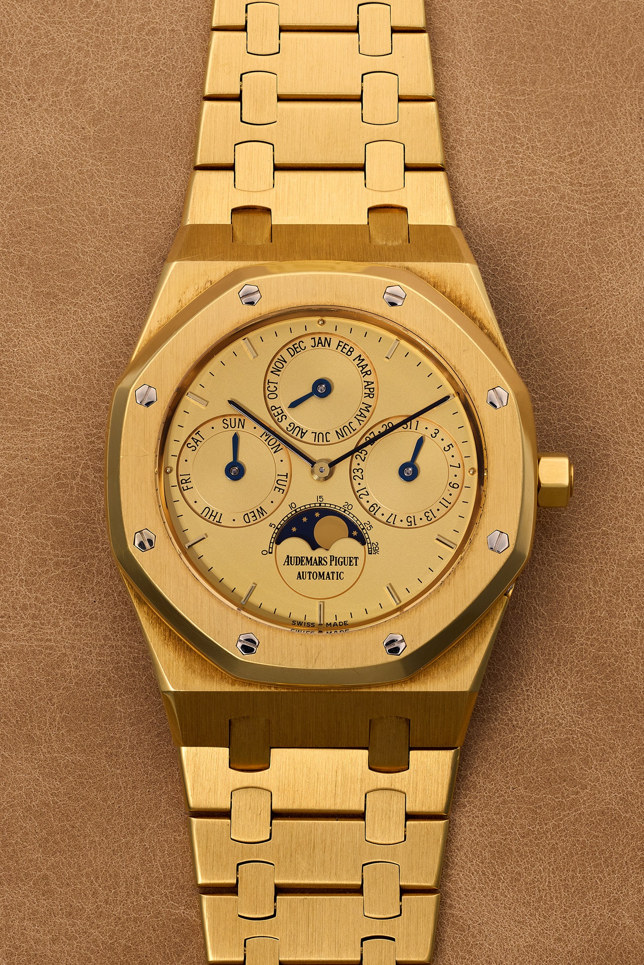 • The present Audemars Piguet Royal Oak Perpetual Calendar ref. 25654BA dating to late 1988 is a beautifully preserved example, with the yellow gold case matching seamlessly with the beautiful champagne dial. The sub-dials are slightly sunken, adding depth and texture to the otherwise-flat dial. As expected from an early MK II dial, it does not include a leap year indication (this feature was only added later, when the movement was updated to the calibre 2120/2802 in 1993) and it features the “new style” AP signature.