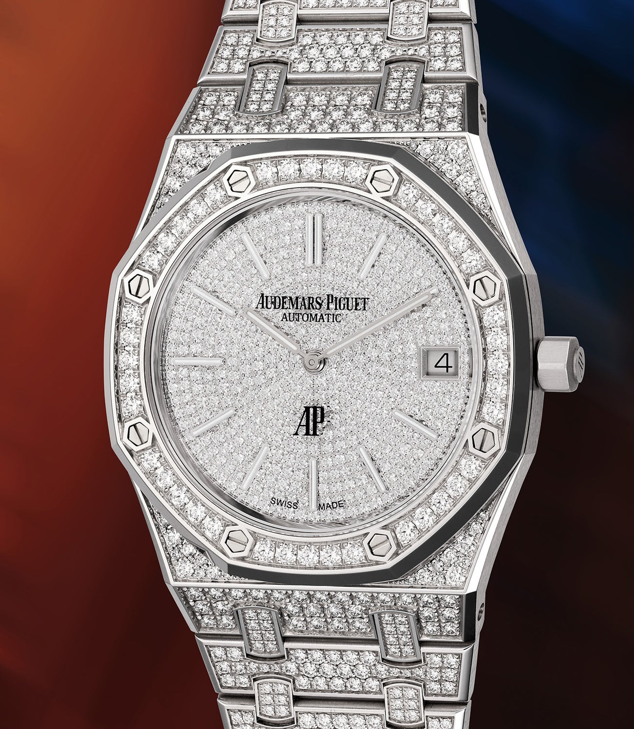 The case and bezel are set with 138 brilliant-cut diamonds, while the dial set with 422 diamonds, and the bracelet with 968 diamonds, with a total approximate carat weight of 8.292. The diamonds to the dial are set in concentric circles, while the AP logo is applied to the crystal instead of the dial, floating above the diamonds.