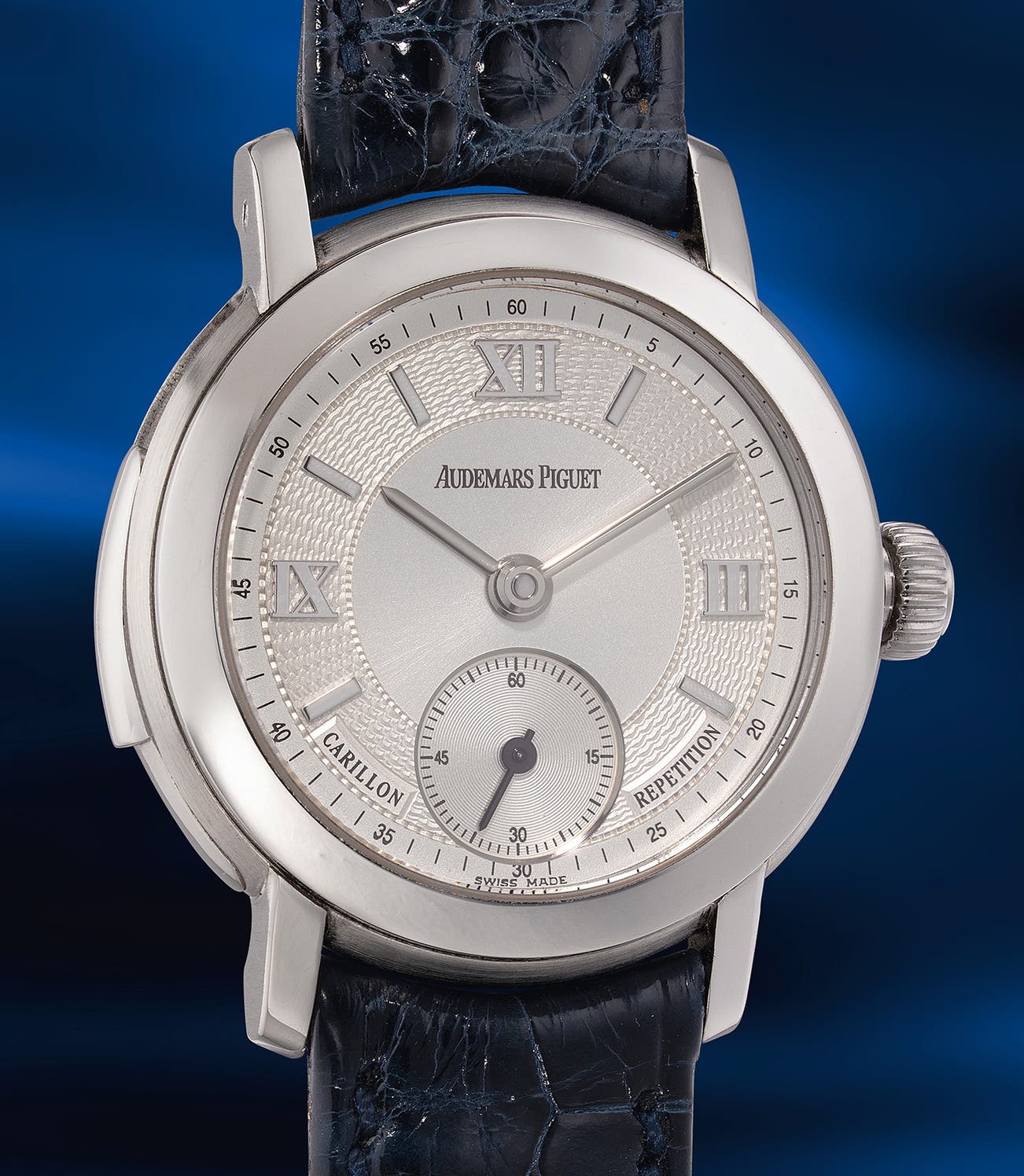 An exquisite and highly rare lady’s platinum carillon minute repeating wristwatch with small seconds and guilloché dial