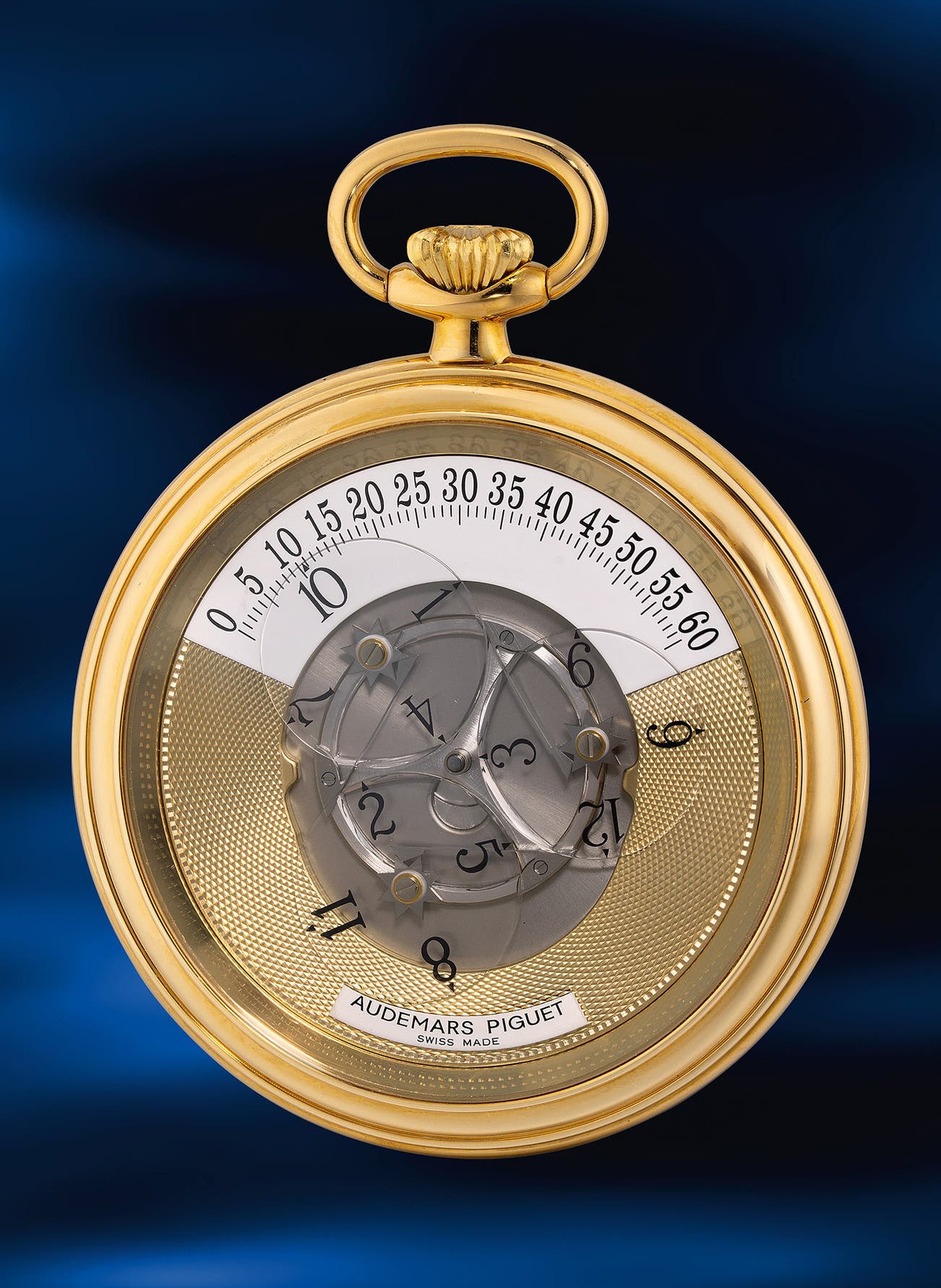 The present example is especially rare as this display is seldomly seen on a pocket watch. This yellow gold example is finely executed - its guilloché lower dial provides texture and depth, contrasting elegantly with the crisp white minute track. Above, the sapphire disks glide almost invisibly, allowing time to appear as if floating across the dial.