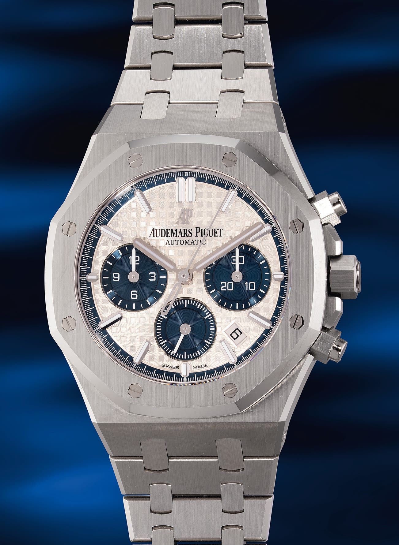 The present example pairs a stainless steel case and integrated bracelet with a silver “Grande Tapisserie” dial and contrasting vibrant blue registers, enhancing both legibility and aesthetic appeal. Powered by the self winding cal. 2385, the model combines robust chronograph functionality with timeless Royal Oak design. Offered in excellent overall condition, this watch captures the enduring appeal of Gérald Genta’s 1972 icon.