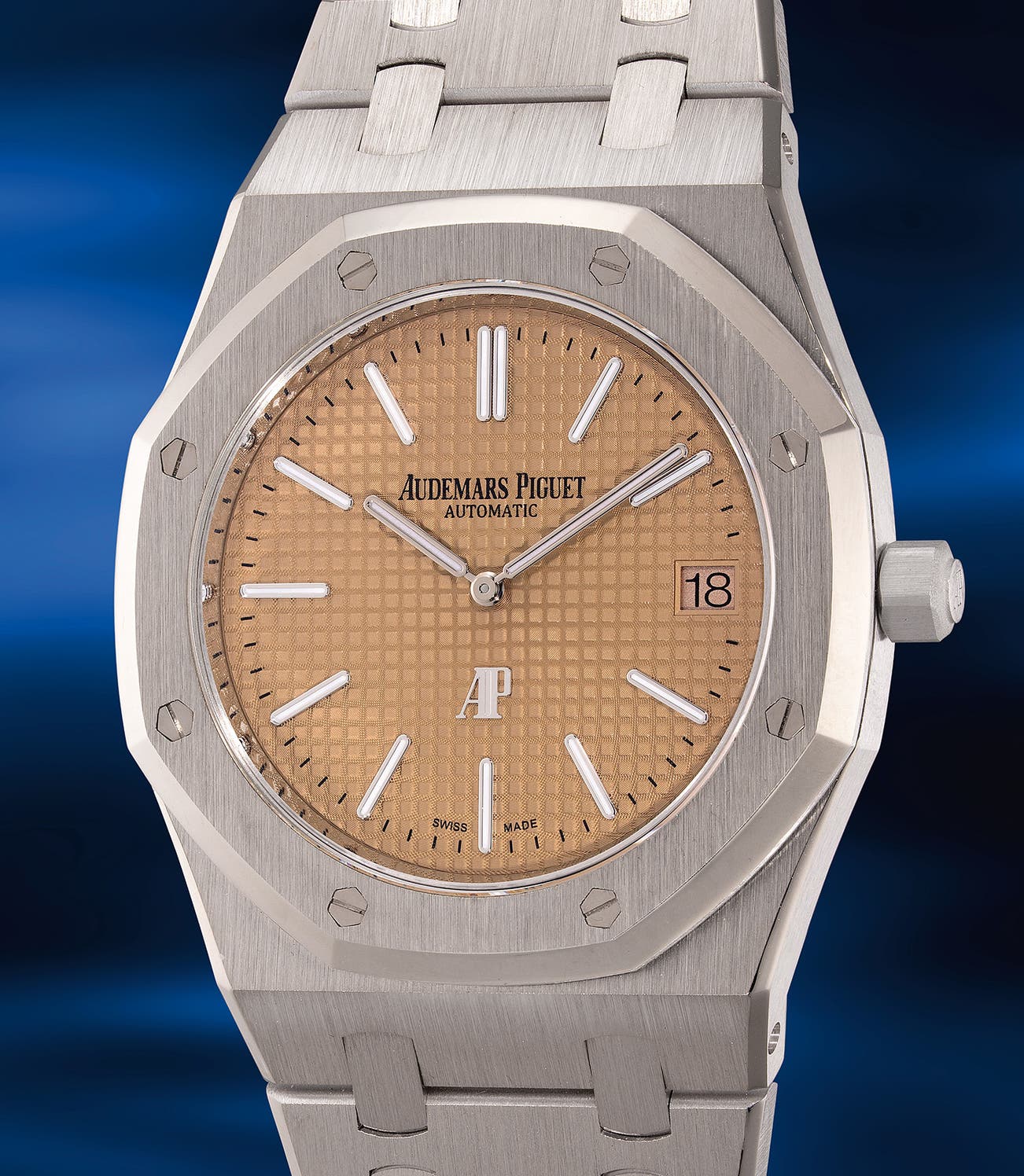 Among the entire production run, one iteration eclipses all others in rarity and desirability: the ref. 15202BC, cased in discreet 18K white gold and distinguished by its striking salmon‑toned dial (Audemars Piguet’s official designation: pink champagne). At first glance, the case resembles stainless steel, yet its unmistakable weight reveals the precious metal composition. The dial itself shimmers between pale rose, pink champagne, and hints of gold, shifting beautifully with the light.