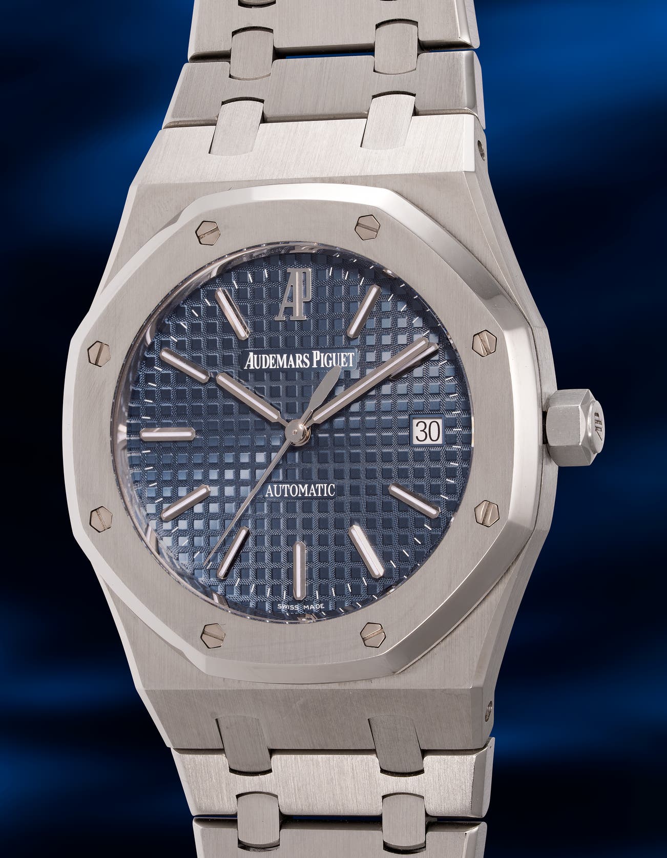 - Discontinued, ref. 15300 has swiftly achieved collectible status. Presented in excellent overall condition, the reference was originally born with a white dial. Interestingly, the owner of the watch had a chance to order a desirable blue dial during a service at Audemars Piguet as seen fitted on the present watch now. This offers an opportunity to acquire a Royal Oak that has become a modern archetype, cementing the model's prestige for decades to come.