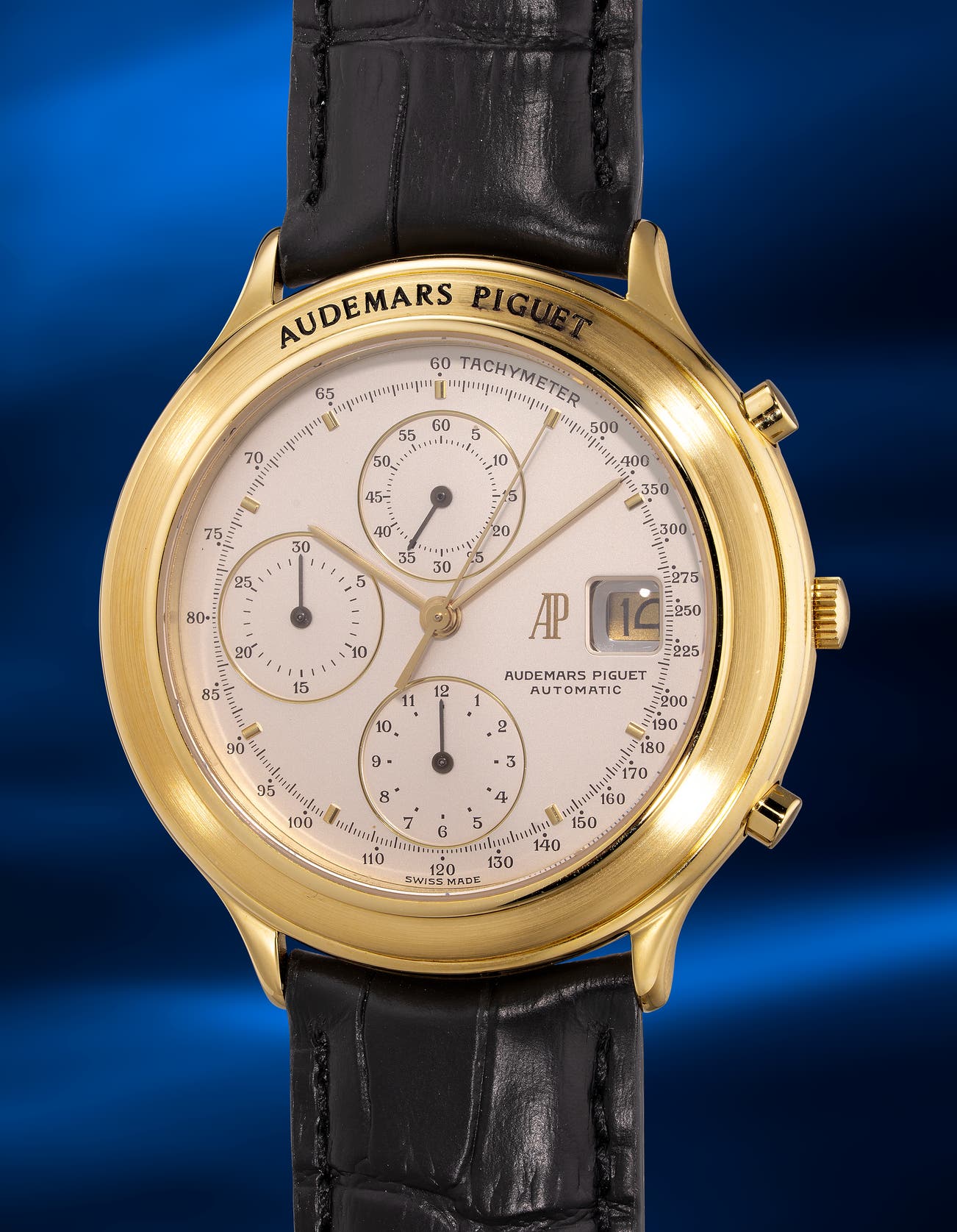 - Offered in excellent overall condition, this elegant yellow-gold Huitième chronograph will appeal to connoisseurs who cherish AP’s neo‑vintage period—its athletic lines and refined finishes pair especially well with a sun-kissed wardrobe.