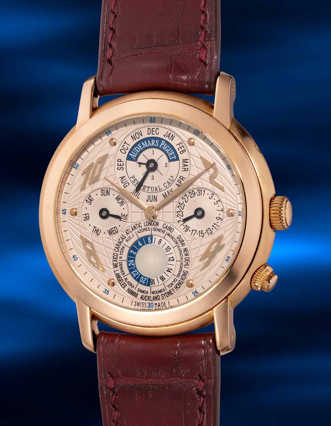 An unusual and impressive pink gold perpetual calendar world time wristwatch with 24 hours and leap year indication