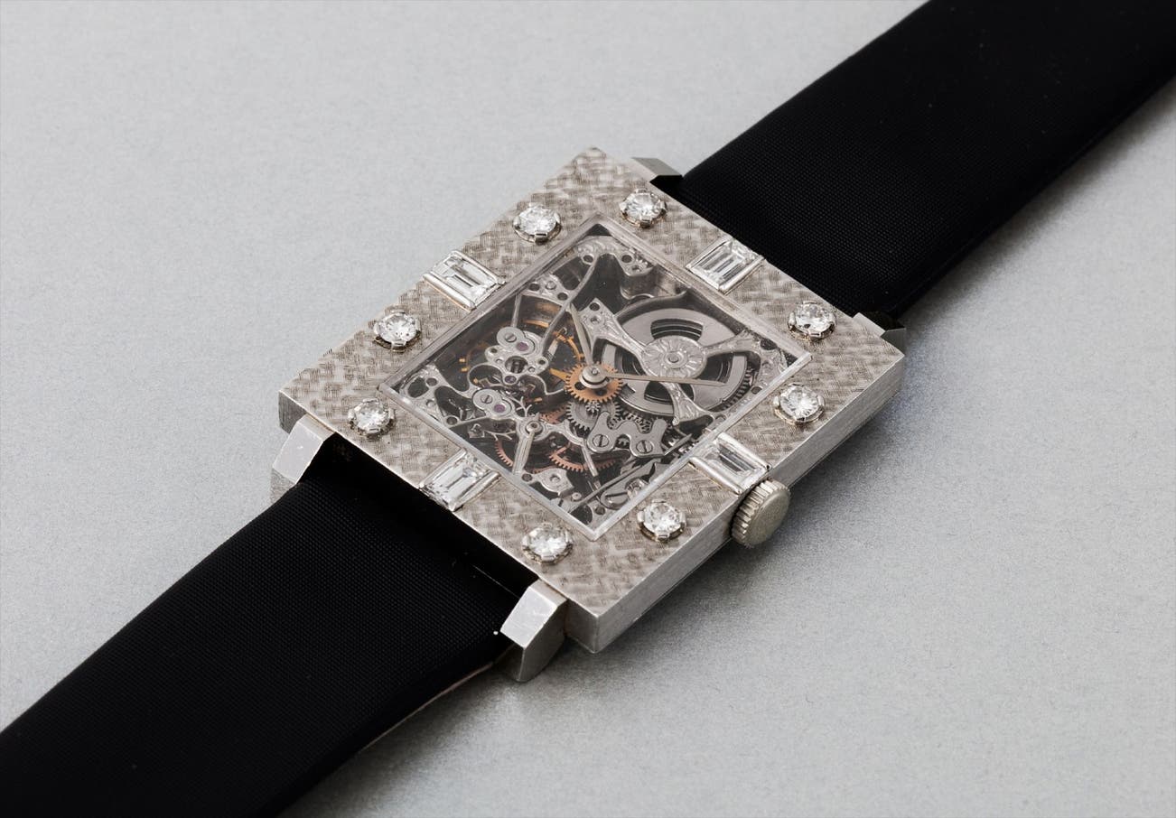 An extremely rare, highly exclusive and large rectangular skeletonized platinum wristwatch with diamond-set hour markers