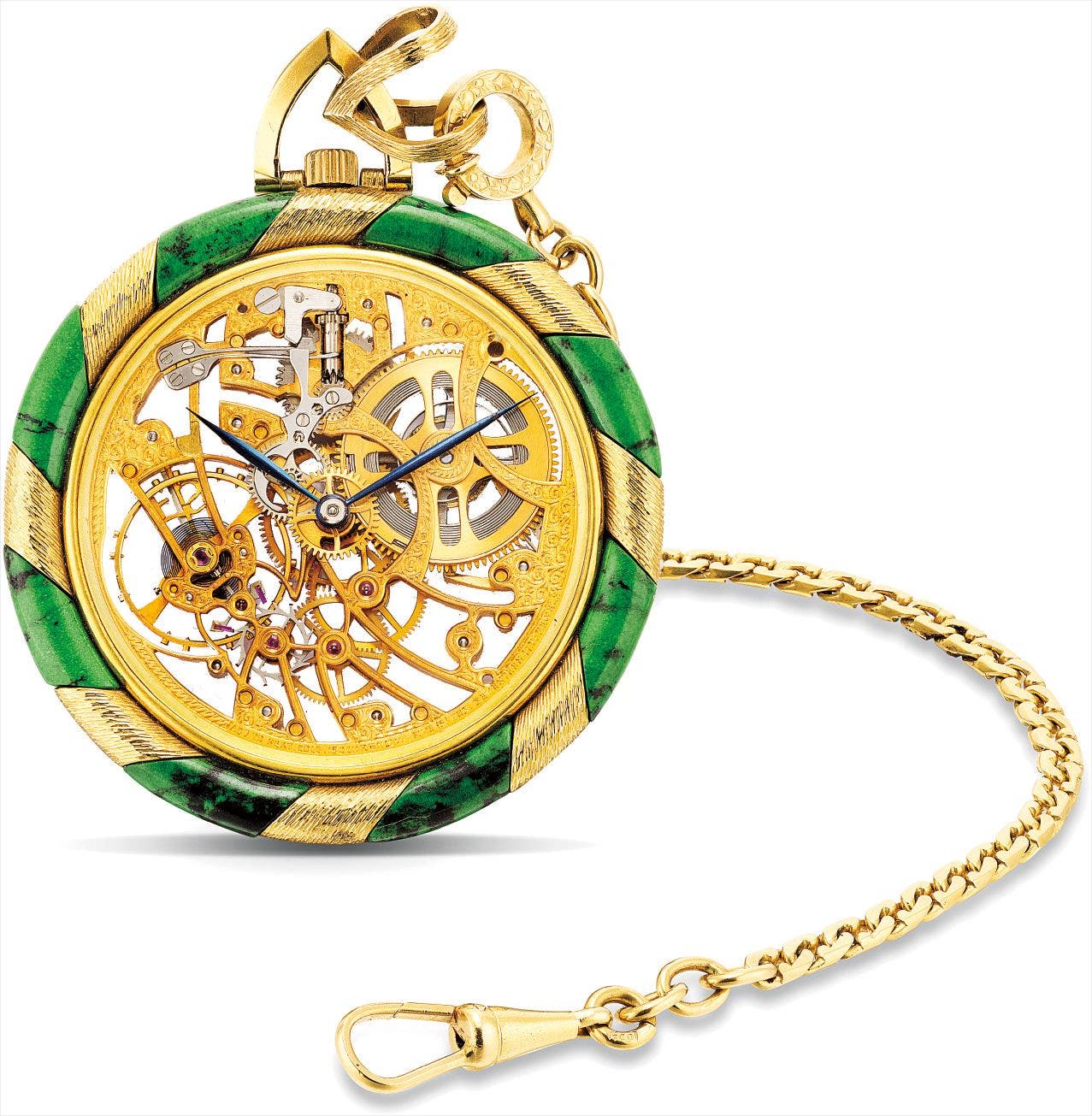 A very rare and unusual yellow gold and jade-set skeletonised dress watch with gold chain
