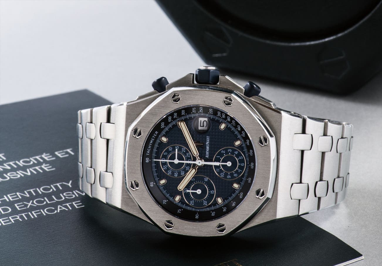 The Offshore incorporated a chronograph complication with silicon caps on the pushers and crown, curved bracelet links, and a thick, visible gasket on the bezel. Due to the substantial size of the case, the automatic caliber 2226/2840 was placed inside an inner anti-magnetic case. The dial features a guilloché “petite tapisserie” pattern – a motif resembling small paver stones. Scholarship suggests that dials found on later Offshores have a total of nine squares along the top of the ‘Audemars Piguet’ signature, whereas these earliest versions only have eight. For over twenty years, the Royal Oak Offshore has remained a centerpiece within the firm’s collection with well over 100 different variations in existence. Its iconic, robust case with signature octoganal bezel can easily be spotted from a distance, and continues to be a favorite amongst collectors. As the only example of the first 100 Offshore’s made to ever be offered at auction, it is a rare gem. Accompanied by its presentation box and certificate of origin, it will surely delight collectors who appreciate historically significant examples of iconic watches.