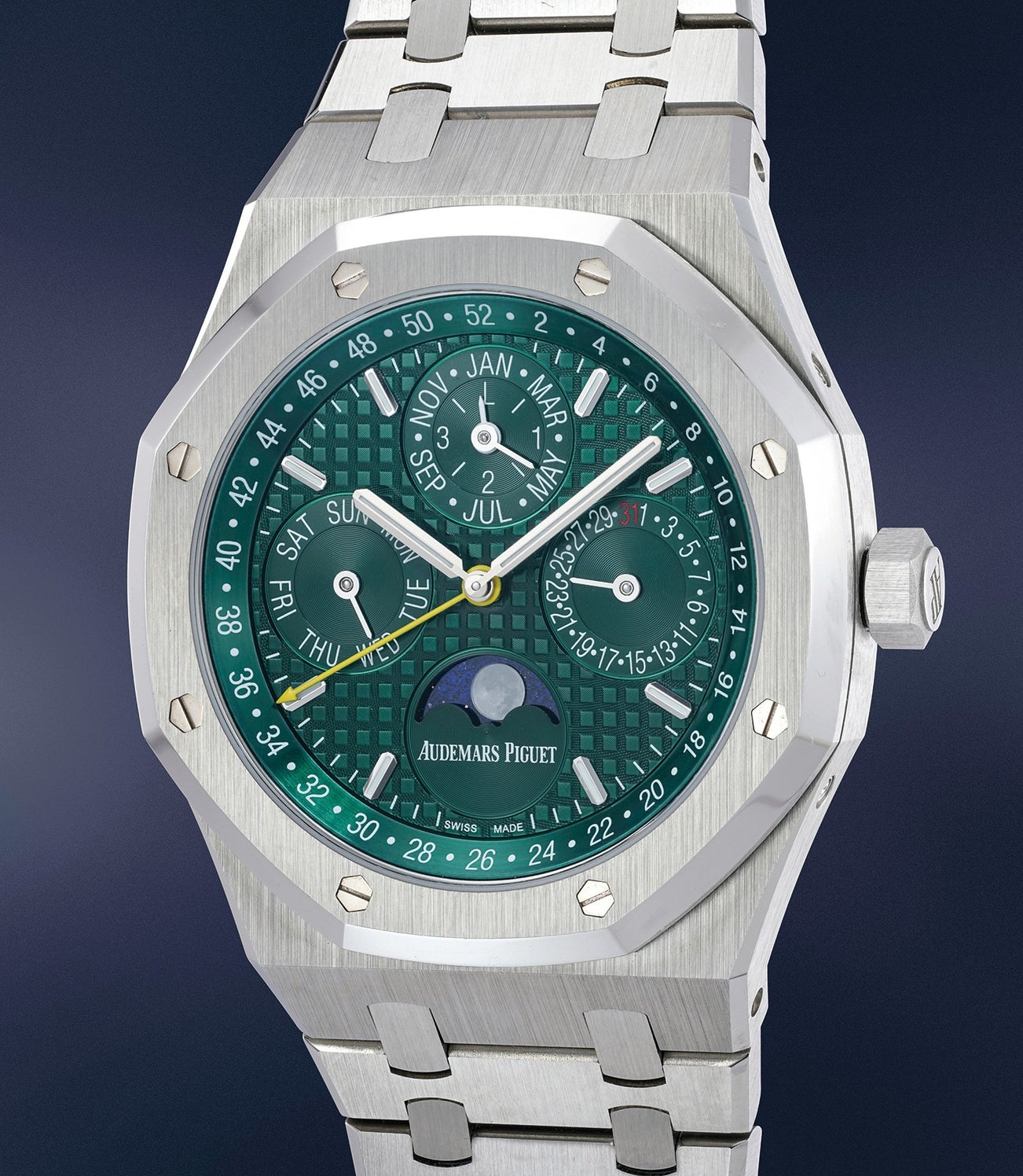 Displaying a stunning green dial with the “Grande Tapisserie" motif, the present watch is one of 50 examples made for the Hong Kong retailer, Unique Timepieces. It features a perpetual calendar complication within the iconic Royal Oak case. An instant success, the present model was immediately sold out when it was launched in 2018. Today, it remains one of the most sought-after Audemars Piguet limited edition models on the market.