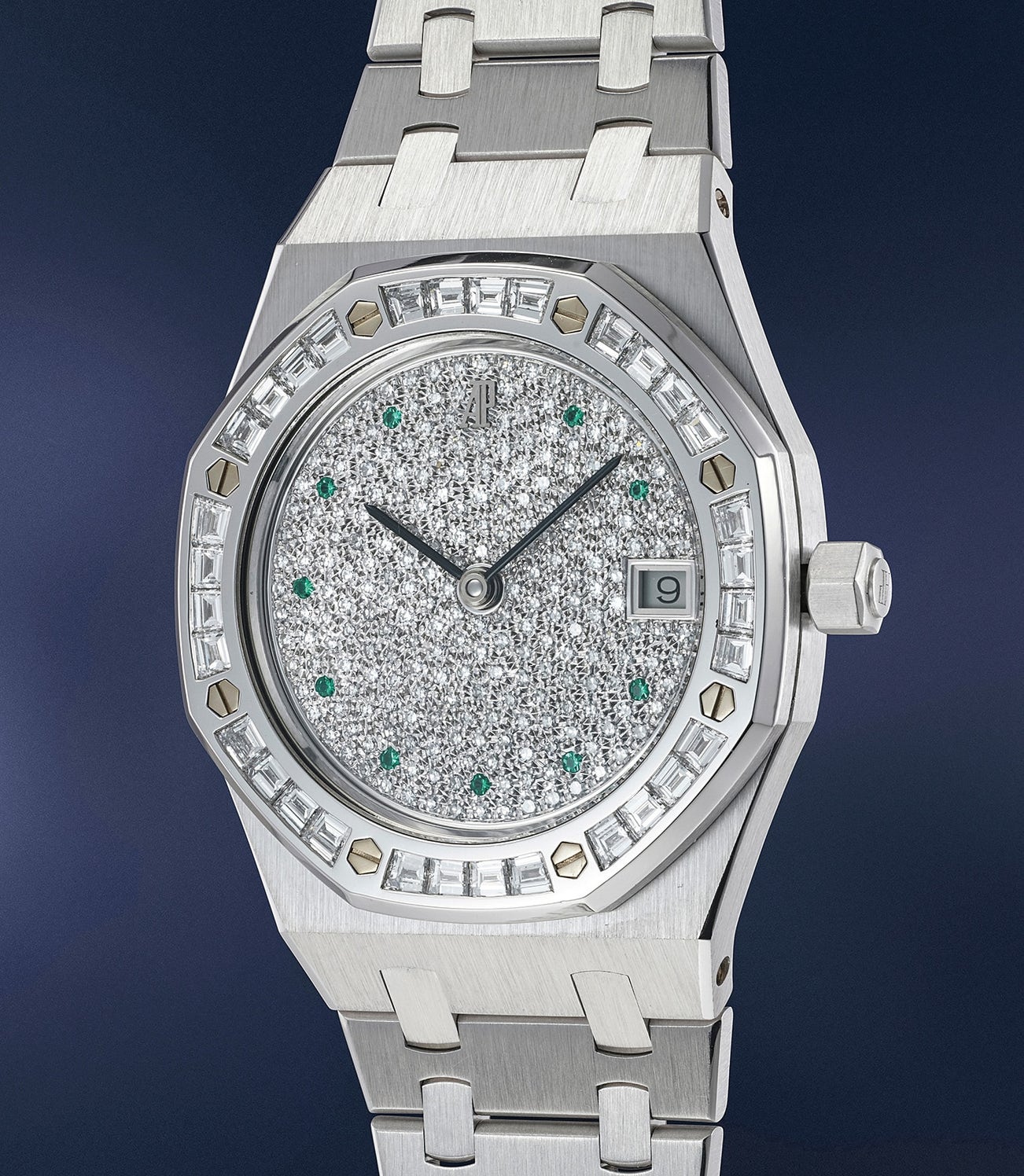 The present superb creation is an example of such trend. Realised in the late 1990s and early 2000s, reference 14840 is known in different metals and different gem-setting both to the dial and the bezel. The present iteration is one of the most striking one: the coolness of the white gold case and bracelet is reprised and amplified by the 24 baguette-cut diamond in the bezel, and then by the pave’ set bezel. In the middle of this explosion of dazzling white, the discrete emerald-set numerals shine like coloured spark in a fireworks display. A truly mesmerising creation that can be enjoyed by the most discerning connoisseurs for its rarity and execution, as well as by the most novice collectors for its unbridled beauty.