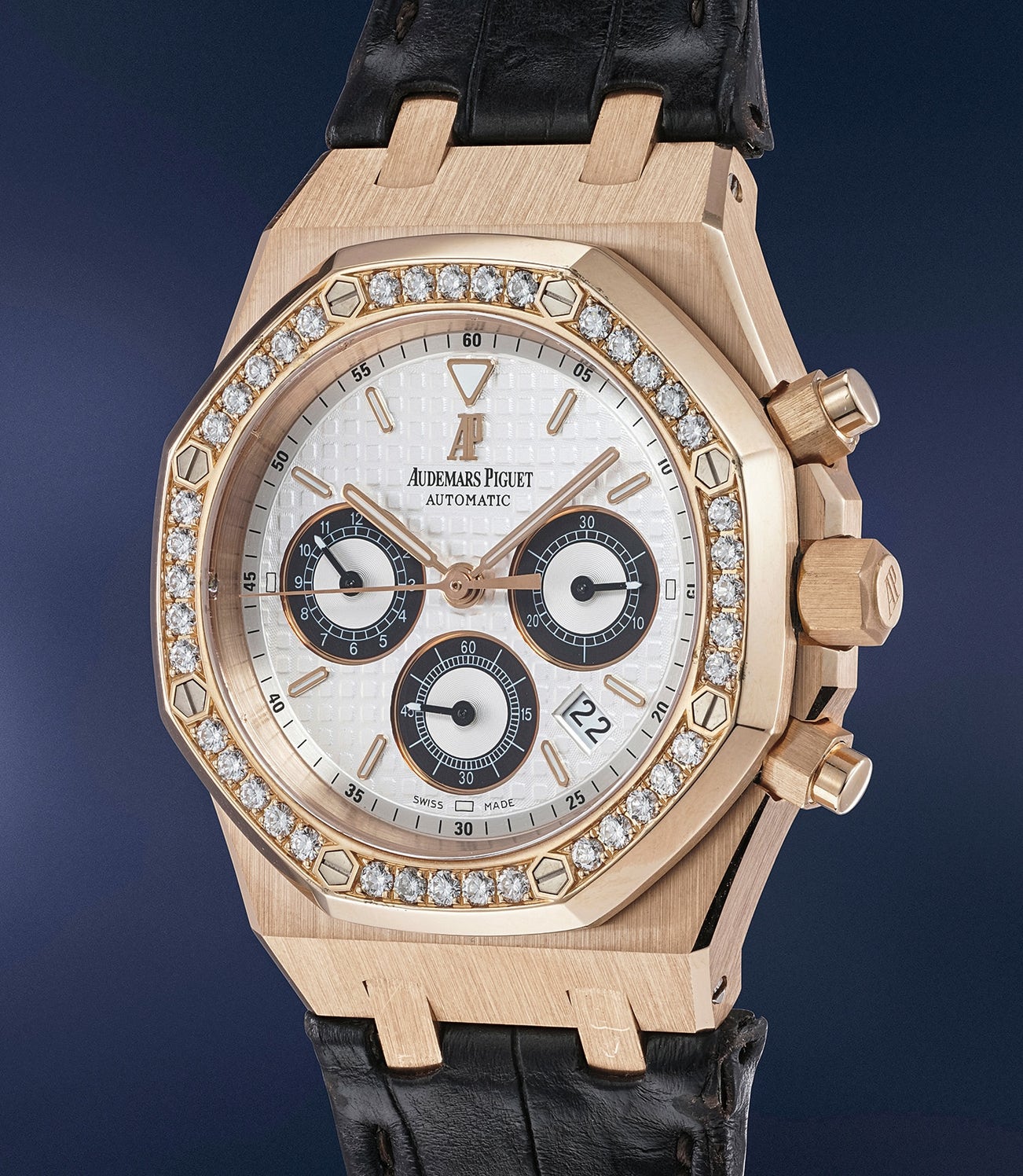 The present chronograph from 2010 is a rare, extremely charismatic, example in pink gold, silver tapisserie dial with a bezel delicately set with brilliant cut diamonds. In fact, to the best of our research it is the first time this reference appears in an international auction room.