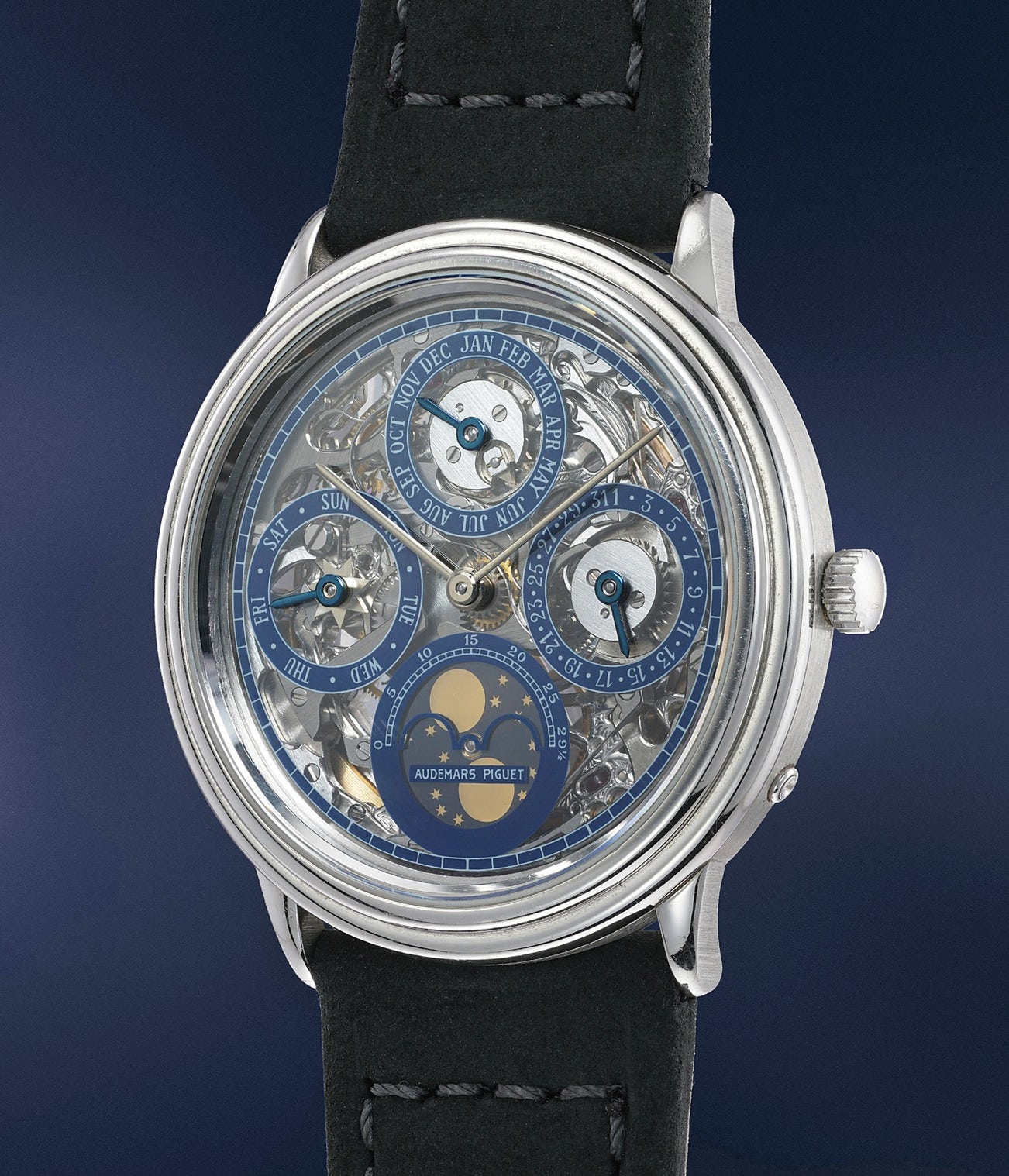 Powered by Audemars Piguet's famous caliber 2120, the present timepiece is cased in platinum and incredibly striking. Displaying a skeletonized dial, the month, day and date rings are rendered in blue, contrasting against the platinum case. At 36 millimeters, the case size is perfect for any occasion, whether discreetly worn under a shirt or a more flamboyant setting.