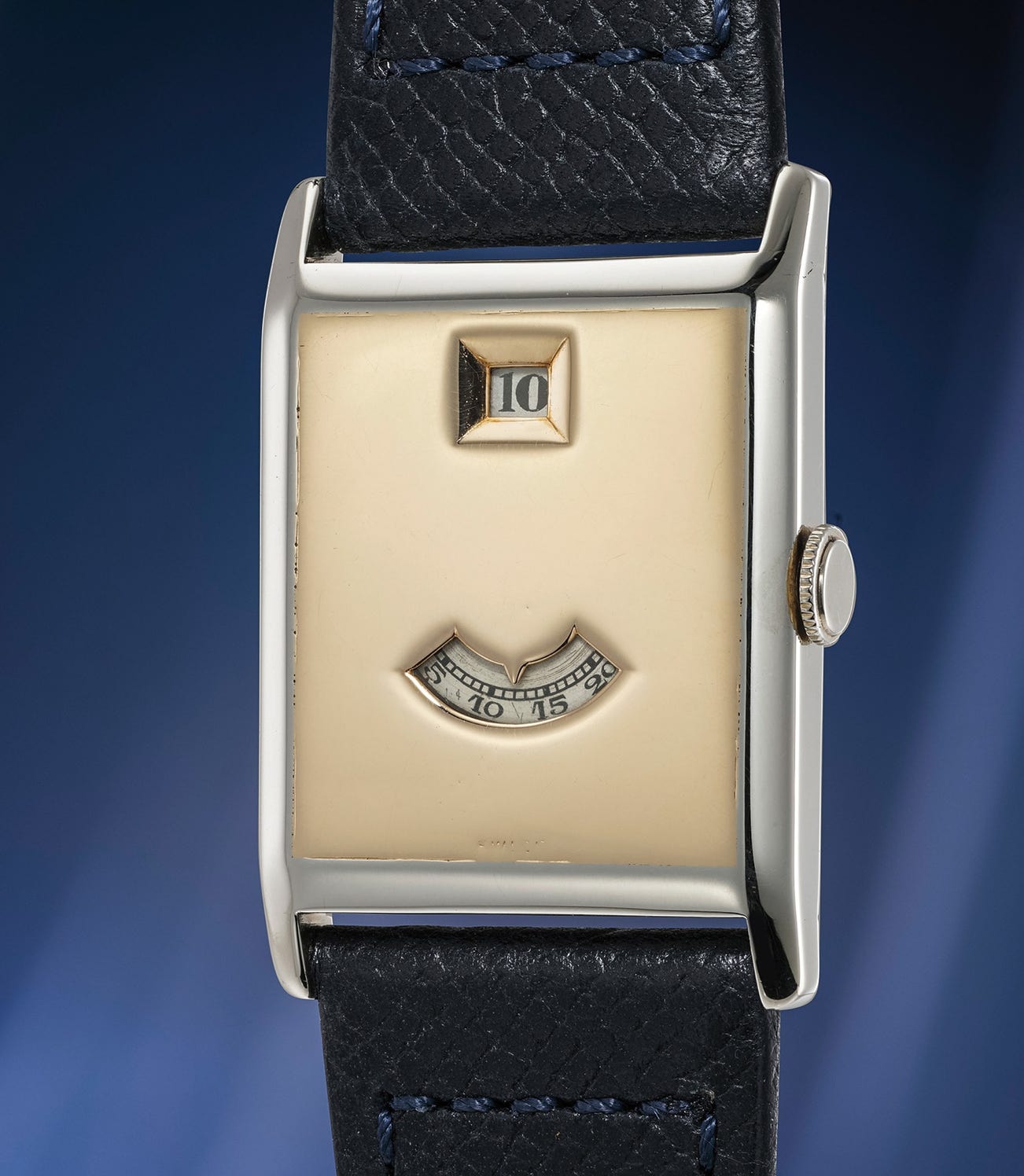 A rare and elegant white and pink gold rectangular jumping hour wristwatch