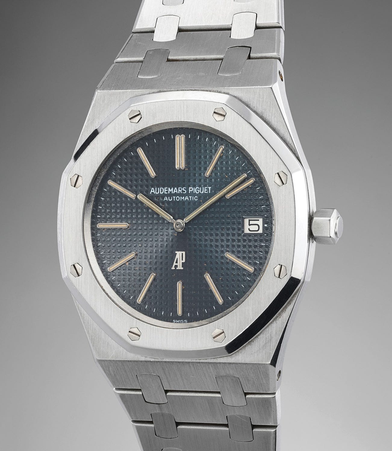 Known as the "A Series", the present watch is the original Royal Oak model produced in the 1970s. Offered in unpolished condition, the present "A series" Royal Oak is an astonishing specimen and one of the most impressive examples to appear on the market in recent years. One can only glance at the protruding angles on the bevels to understand that this timepiece displays factory finishes. The bracelet displays sharp, decisive vertical finishes, which could only be original to the timepiece. Furthermore, the case is incredibly thick and the reverse of the watch displays a sand blasted finish.