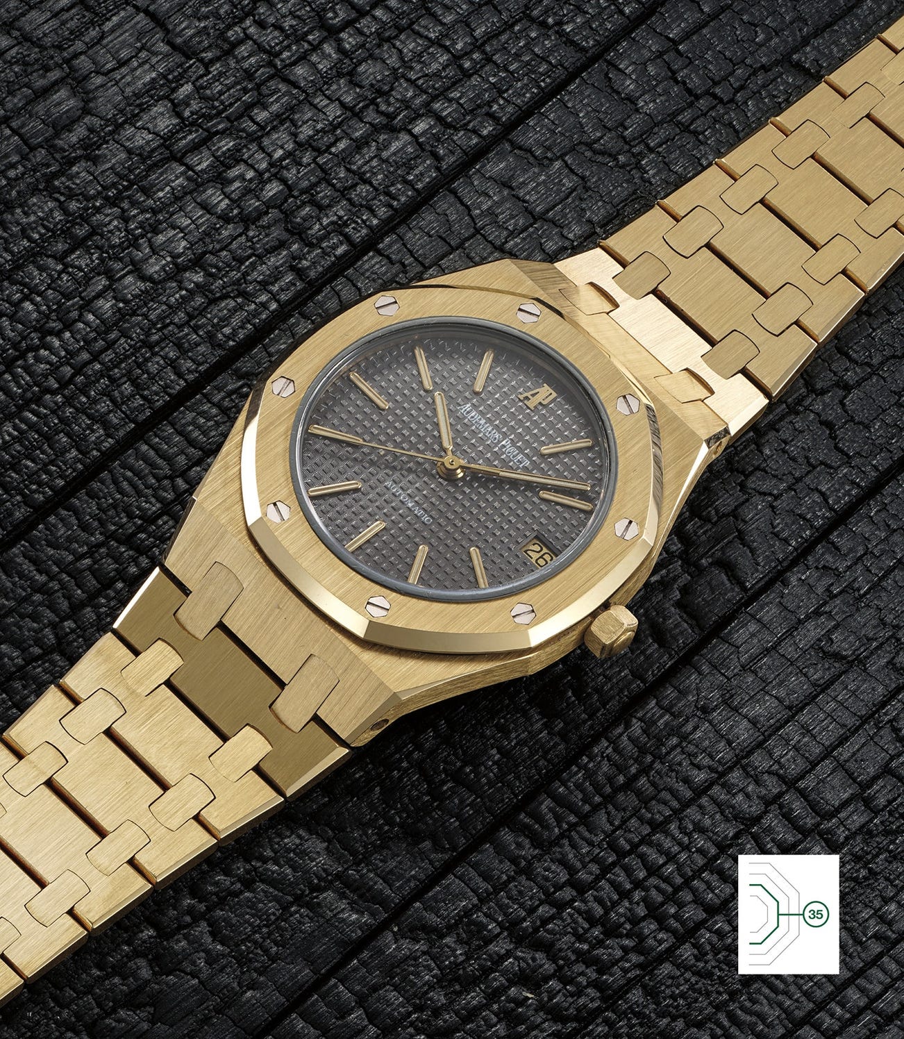 With a more restrained 35mm diameter, this reference was the first Royal Oak to be equipped with centre seconds, it was available in steel, yellow gold, white gold and two-tone versions. The majority of the models were equipped with calibre 2123, but some of the later creations were powered by calibre 2125 and others by calibre 2124. From 1982 onwards, at least 96 watches had their mechanical calibre replaced by the quartz calibre 2506, which was originally fitted in at least 36 watches.