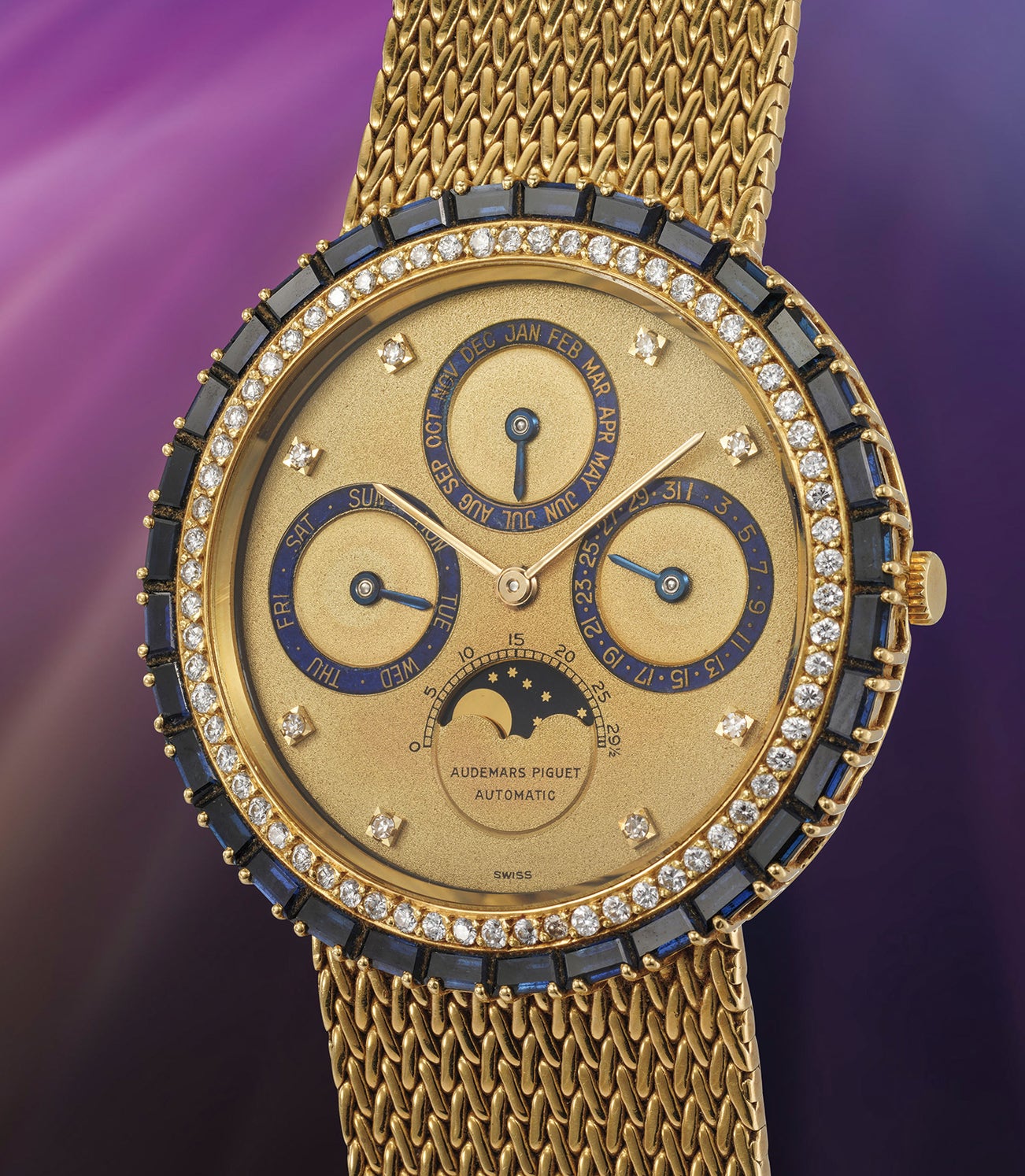 An extremely uncommon, highly impressive and very well-preserved yellow gold automatic perpetual calendar wristwatch with moonphases, diamond and sapphire-set bezel and integrated bracelet
