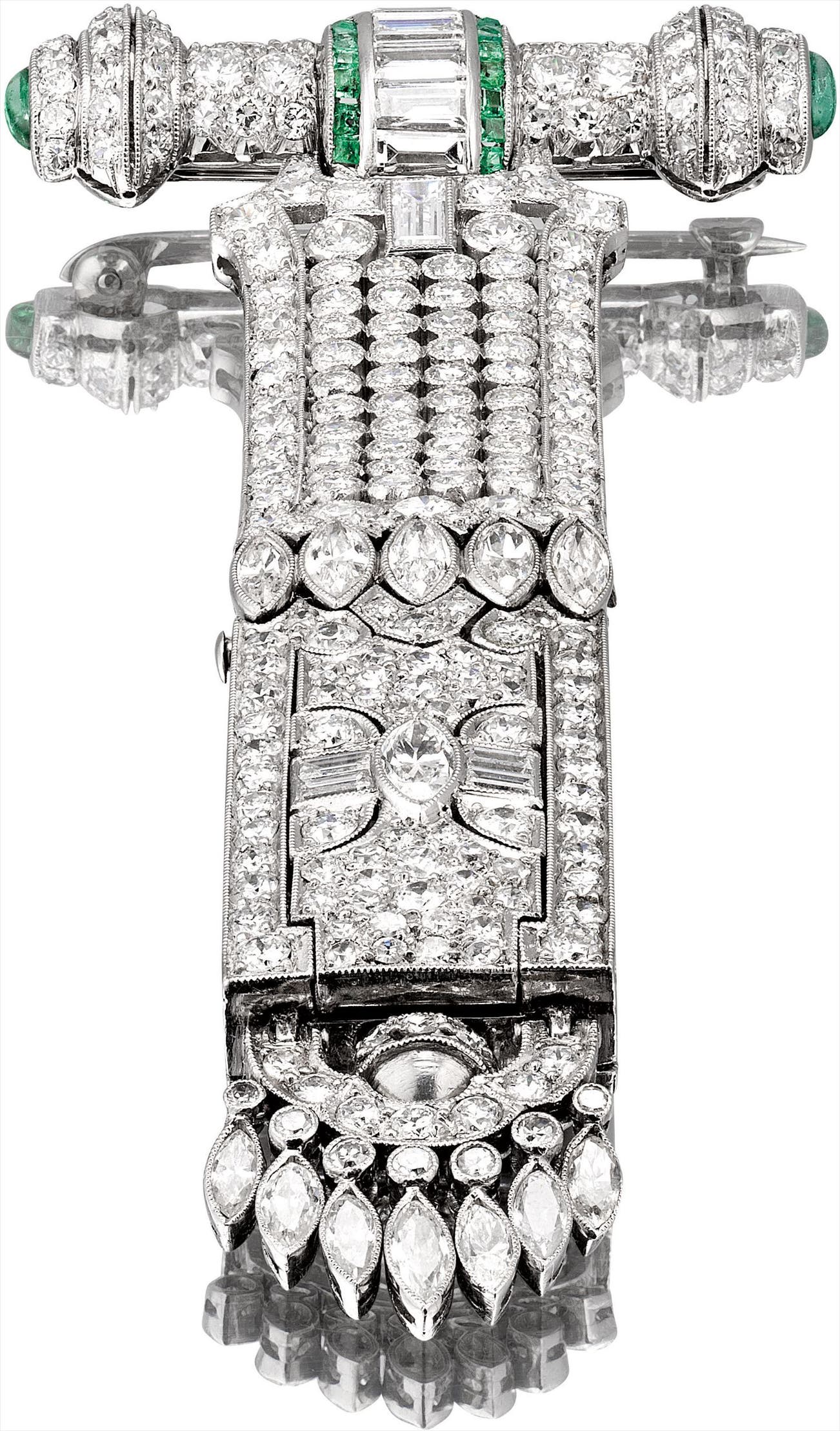 Traditional Indian gemstones were often polished rather than faceted and set in closed back mountings. This platinum pendant watch is lavishly set with diamond and baguette-cut and cabochon emeralds in very much in the Indian style. At the bottom of the brooch, the diamonds would appear to form a crown, further enhancing the overall look and sophistication. Of extreme rarity and quality, this present pendant watch is truly a work of art in the jewellery and horology world.