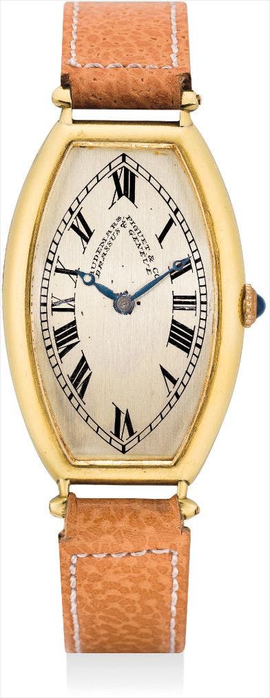 An extremely rare, attractive and early tonneau-shaped yellow gold wristwatch