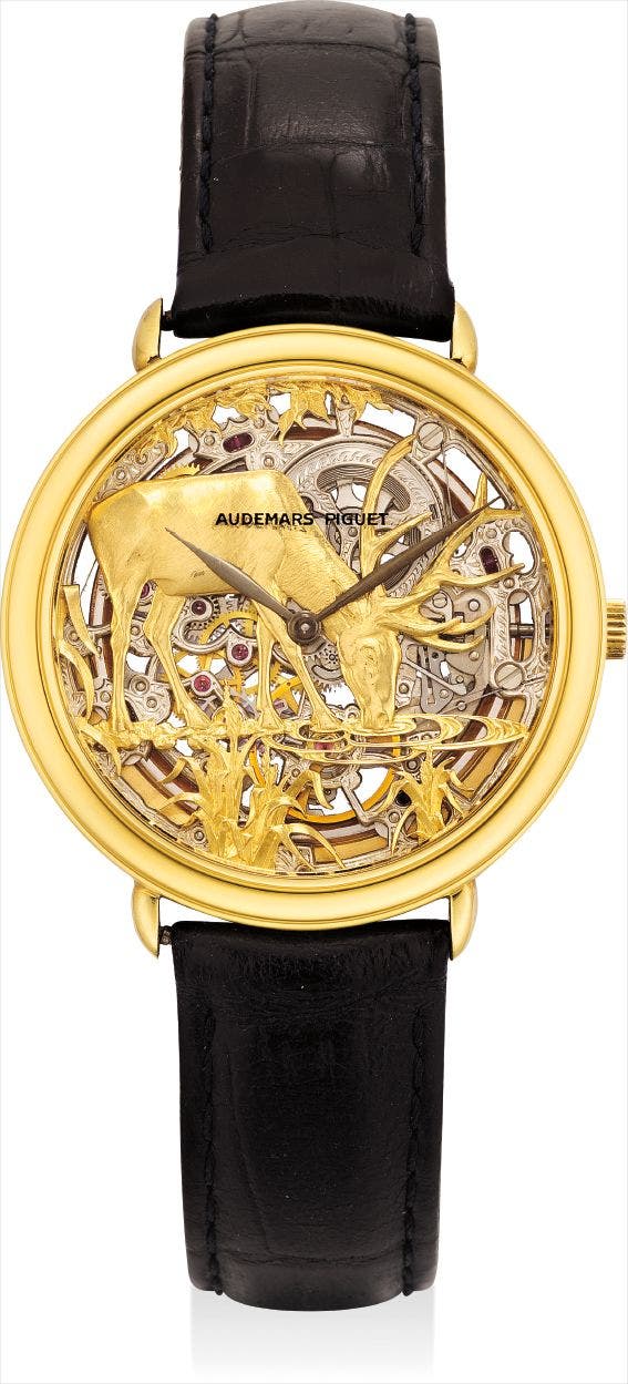 Beyond its aesthetic appeal and refinement, it has to be pointed out that the present piece is most probably a special request, as hinted to by the rotor engraved P and J, arguably the initials of the original owner. According to Audemars Piguet, similar dials have been made with motives such as birds or cars, but the "deer" motive appears to be extremely rare.