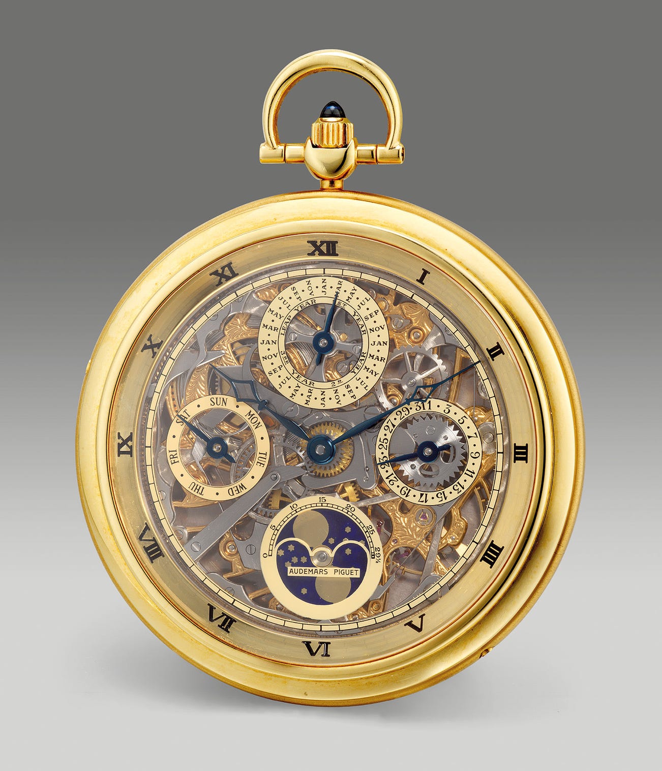 A fine and attractive yellow gold skeletonized perpetual calendar pocket watch with moon phases and leap year indication
