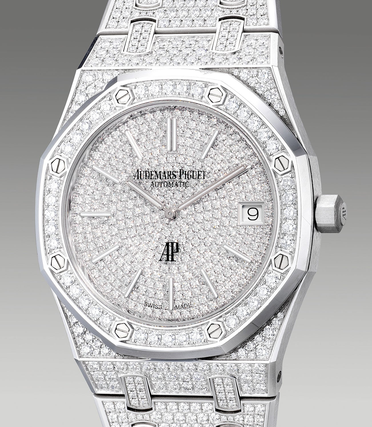 Released in 2018 with a low production output, the Audemars Piguet ref. 15202BC.ZZ.1241BC.01 is a statement piece. fully fitted with diamonds to its full capacity, the case and bracelet is extravagantly set with 1,102 brilliant-cut diamonds weighing a total of 7.09 carats, while its pavé dial is set with 384 brilliant-cut diamonds weighing a total of 2.44 carats. Redefining the idea of the sports watch, the present example is truly a mesmerizing piece to look at and remains still a comfortable piece to wear.