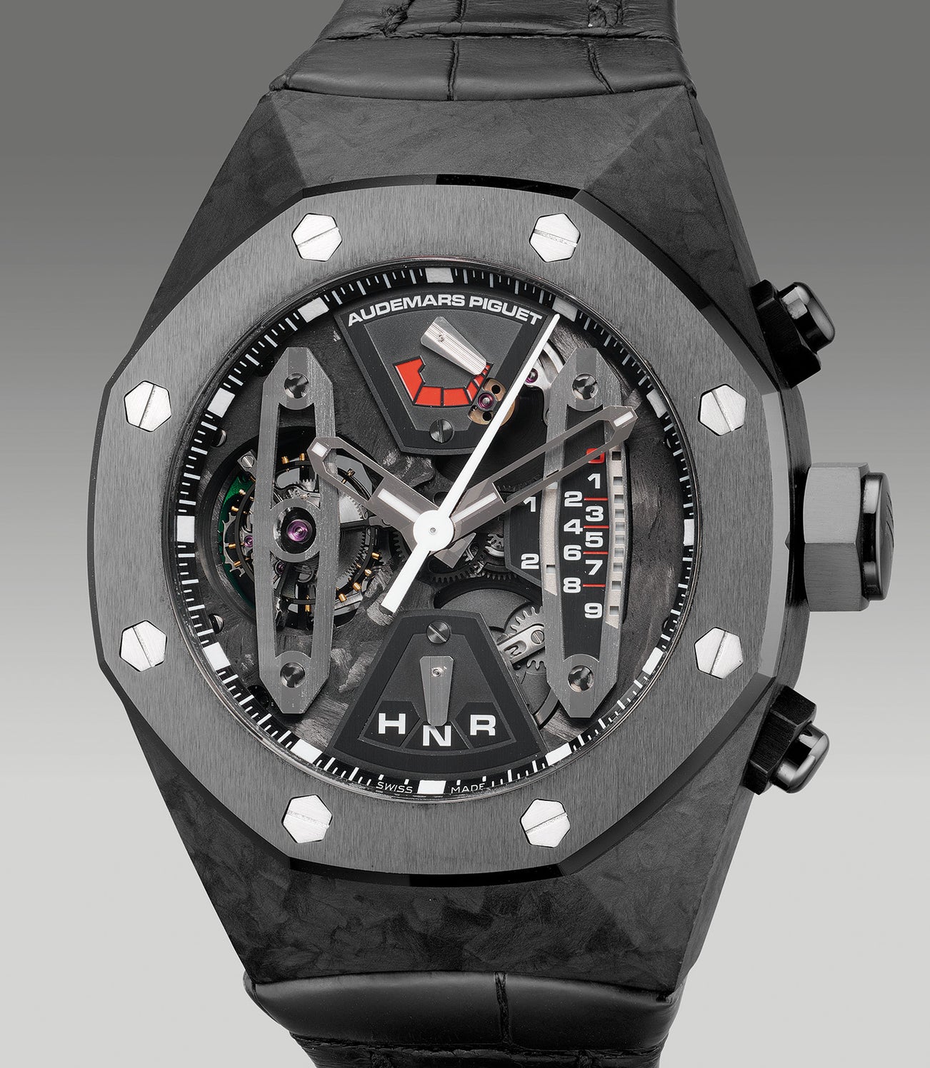 The Royal Oak Concept Carbon CCW1 displays remarkable ingenuity within its angular architectural design and multi-layered structure, allowing the wearer an intimate glimpse of the impressive mechanical marvel. Housed internally is the calibre 2985 tourbillon chronograph with 388 components and offering a roaring 237 hours of power reserve. The CCW1 also features a 30-minute chronograph with a linear display, a dynamograph indication at 12 o’clock which indicates the quality of the torque in the mainspring, and the convenience of a function selector at 6 o’clock— R for remontoir (winding), N for neuter (neutral) and lastly, H for heures (hours). With a handful of ingredients fused into a feature-packed forged carbon case with ceramic bezel and titanium caseback, the watch still wears with incredible lightness and comfort.