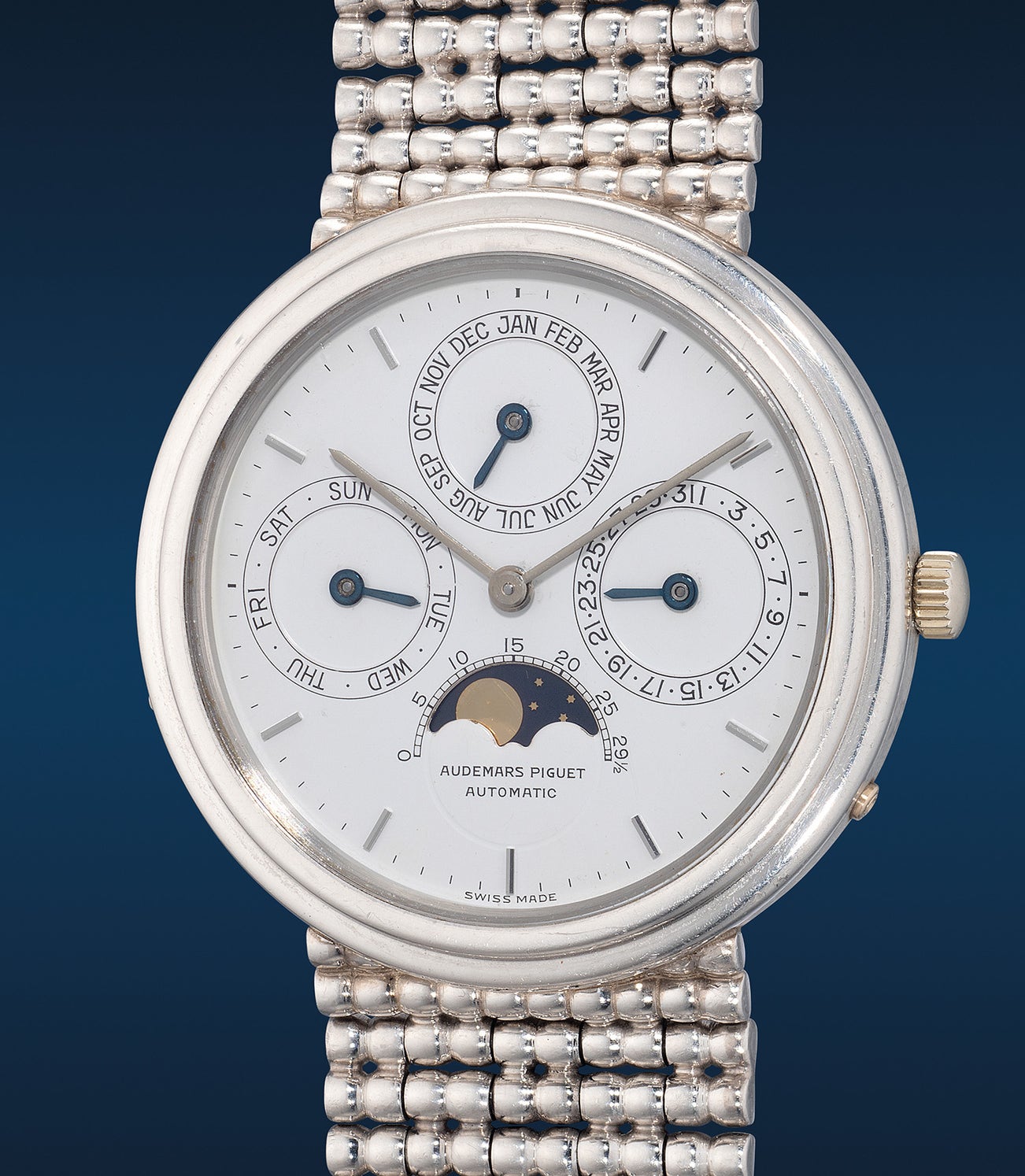 The Quantieme Perpetuel Automatique ref. 25549 (also known as 5549) was in production from 1977 until 1991 with an average of 12 pieces made per year. According to Audemars Piguet, approximately 156 yellow gold and 19 white gold examples left their workbenches within that period of time. While scarce amount of the reference are out there in the wild, only two examples in platinum including the present example with bracelet are known, making the present timepiece one of the rarest variant amongst all.