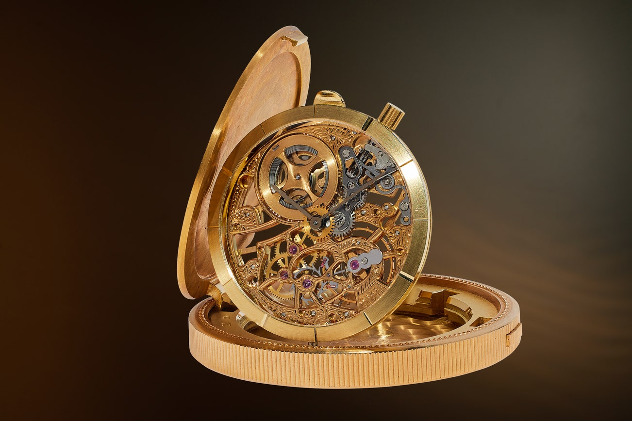 Audemars Piguet created a fine selection of rare coin watches, and the present model with skeletonized movement was their most prestigious. The 1891 Liberty Head coin has a bas-relief “Lady Liberty” on the front cover, while the reverse features the Great Seal of the United States along with “United States of America Twenty Dollars.” To open the watch, one must find the nearly invisible push button in the milled coin-edge side. The hidden case houses a spectacular, skeletonized, and hand-engraved movement with solid 14 karat gold bridges. This inner case is hinged and lifts up from within the coin to display the time.