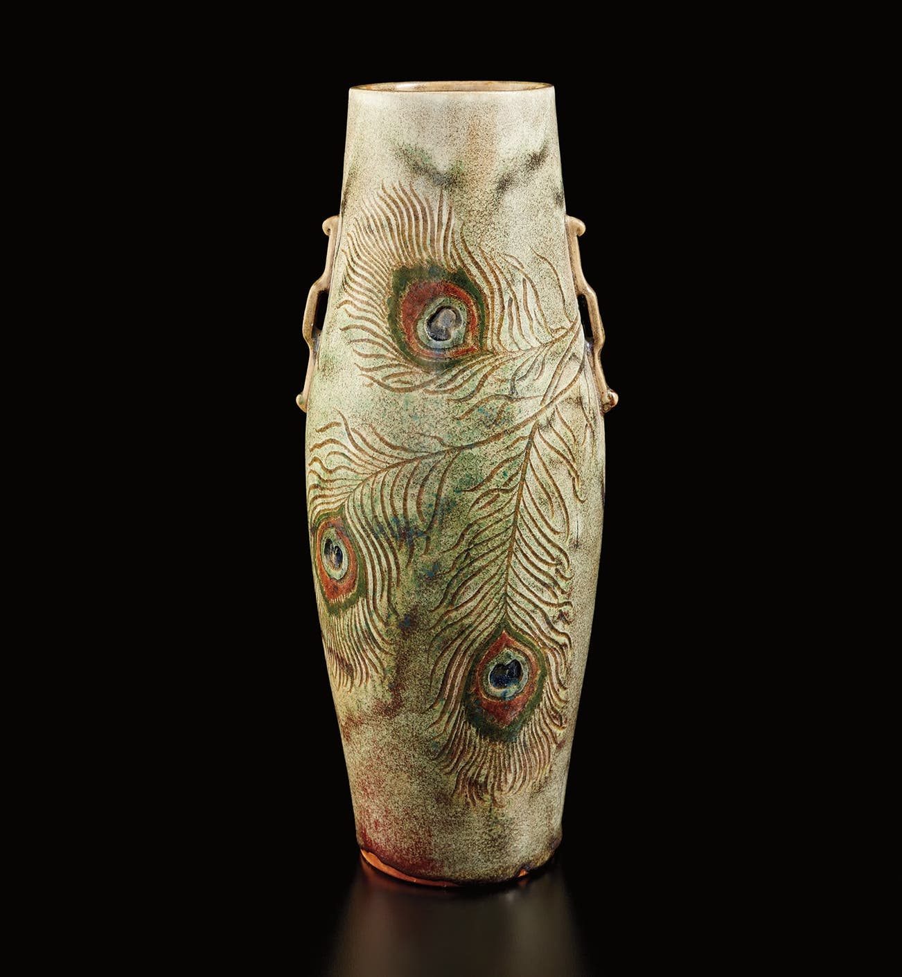 In 1889, Auguste Delaherche won a gold medal at the Exposition Universelle in Paris, where he showcased ceramic vases with peacock feather decorations, including the present model. This presentation established Delaherche as one of preeminent ceramists of his generation and helped to usher in the Art Nouveau style. Later in his career, Delaherche preferred to use drip glazes rather than representational imagery, but the style of his work remained indebted to Eastern influences. These works demonstrate a shift from the figural to the abstract in Delaherche’s œuvre, and they reveal mastery at each iteration of his artistic practice.