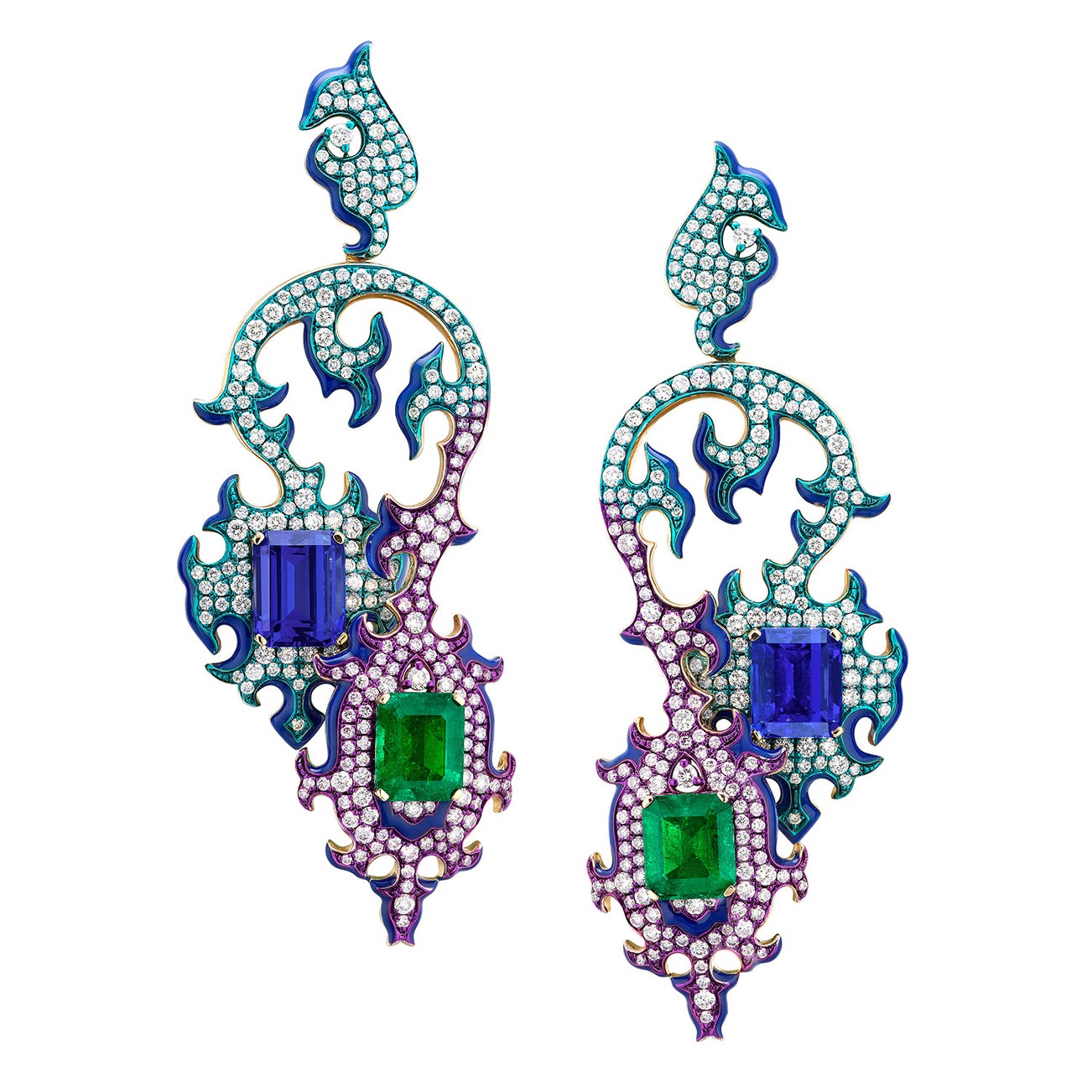 A Pair of Tanzanite, Emerald, Diamond and Coloured Enamel 'The Phoenix' Feathers' Earrings