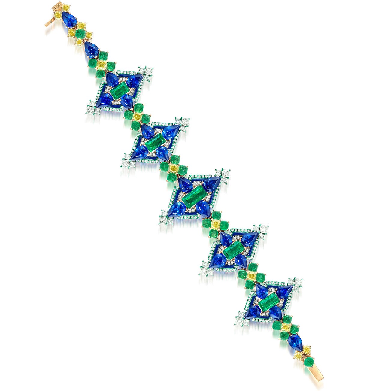 An Emerald, Sapphire, Coloured Diamond, Diamond and Coloured Enamel 'The Flamboyant' Bracelet