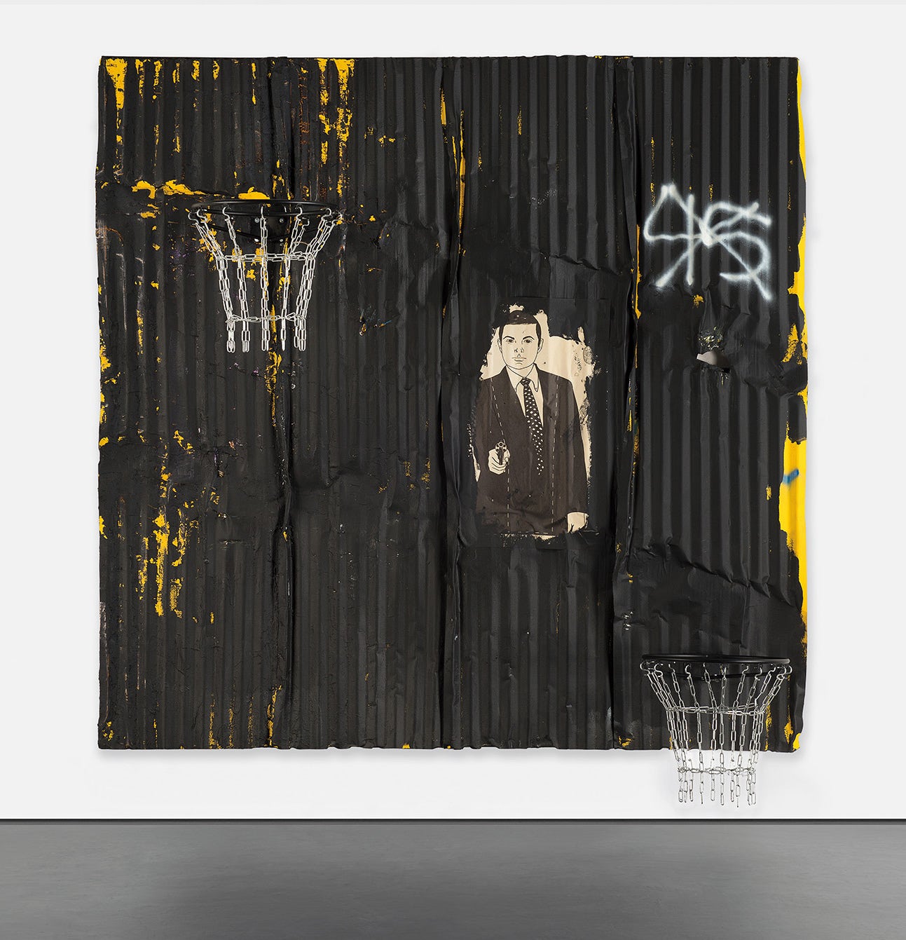 house latex, spray acrylic and paper on corrugated metal with metal and chainlink basketball hoops