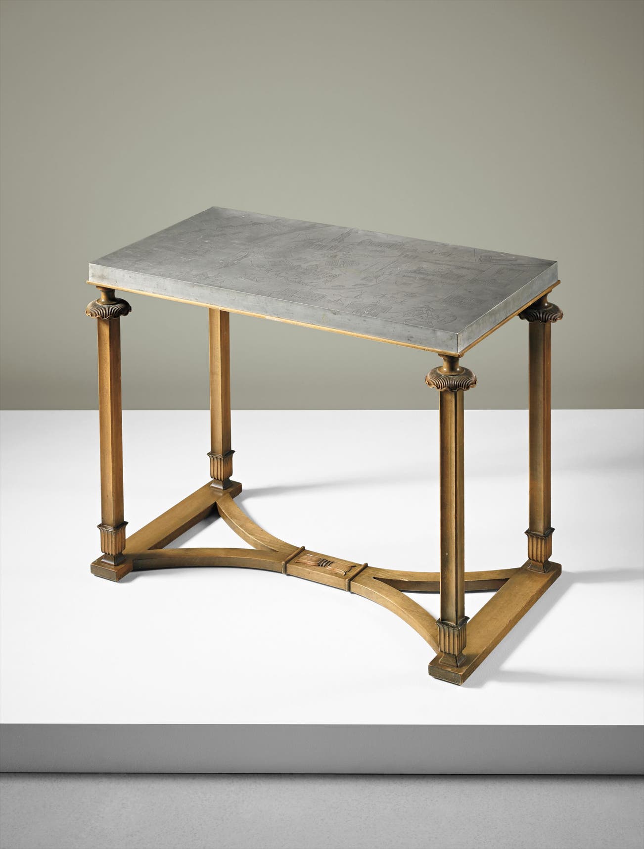 Produced by AB Nordiska Kompaniet for Svenskt Tenn, Stockholm, Sweden. Underside with manufacturer's metal labels impressed A•B•NORDISKA KOMPANIET STOCKHOLM and other impressed NK R 33243 - C 11 10 30. Tabletop marked with manufacturer's mark Svenskt Tenn, Stockholm city mark, date mark D8.