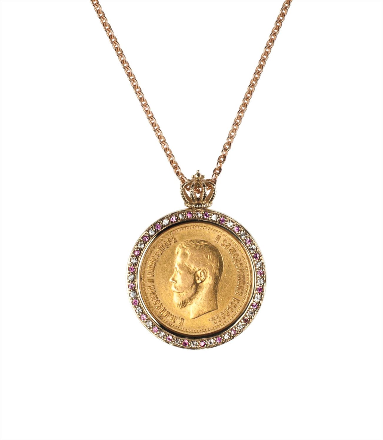 A Gold, Pink Sapphire and White Sapphire 'Tsar Nicholas' Coin Necklace