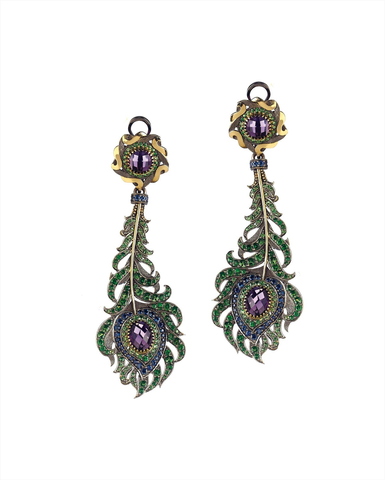 Each suspending an articulated feather drop, accented by circular-cut sapphires, tsavorite and vari-cut amethyst, from a similarly designed surmount, mounted in 14K yellow gold, length 3 1/4 inches.