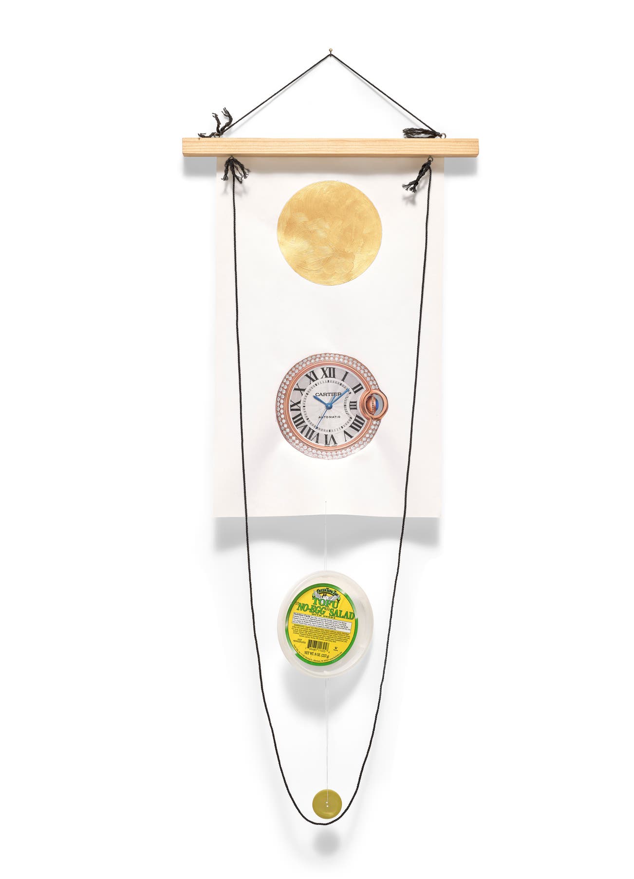 wood, string, thread, Tyvek, acrylic paint, paper collage, button and screw eyes