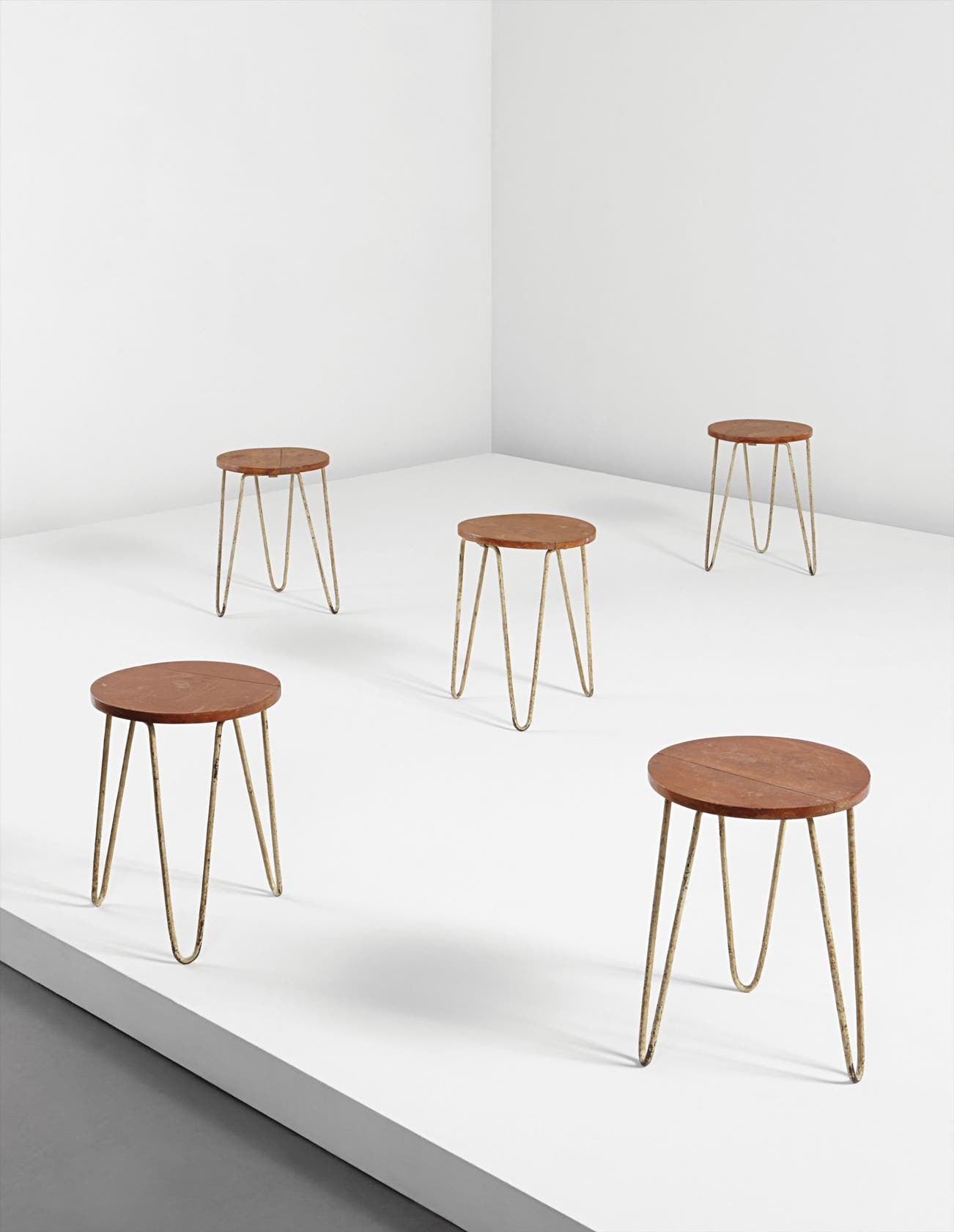 Underside of each stool respectively painted with M.O.A.1./A.T.M.A.522, A.T.M.A.520/M.O.A.2, A.T.M.A.519/M.O.A.3, M.O.A.4/A.T.M.A.521, and M.O.A.6/A.T.M.A.524.