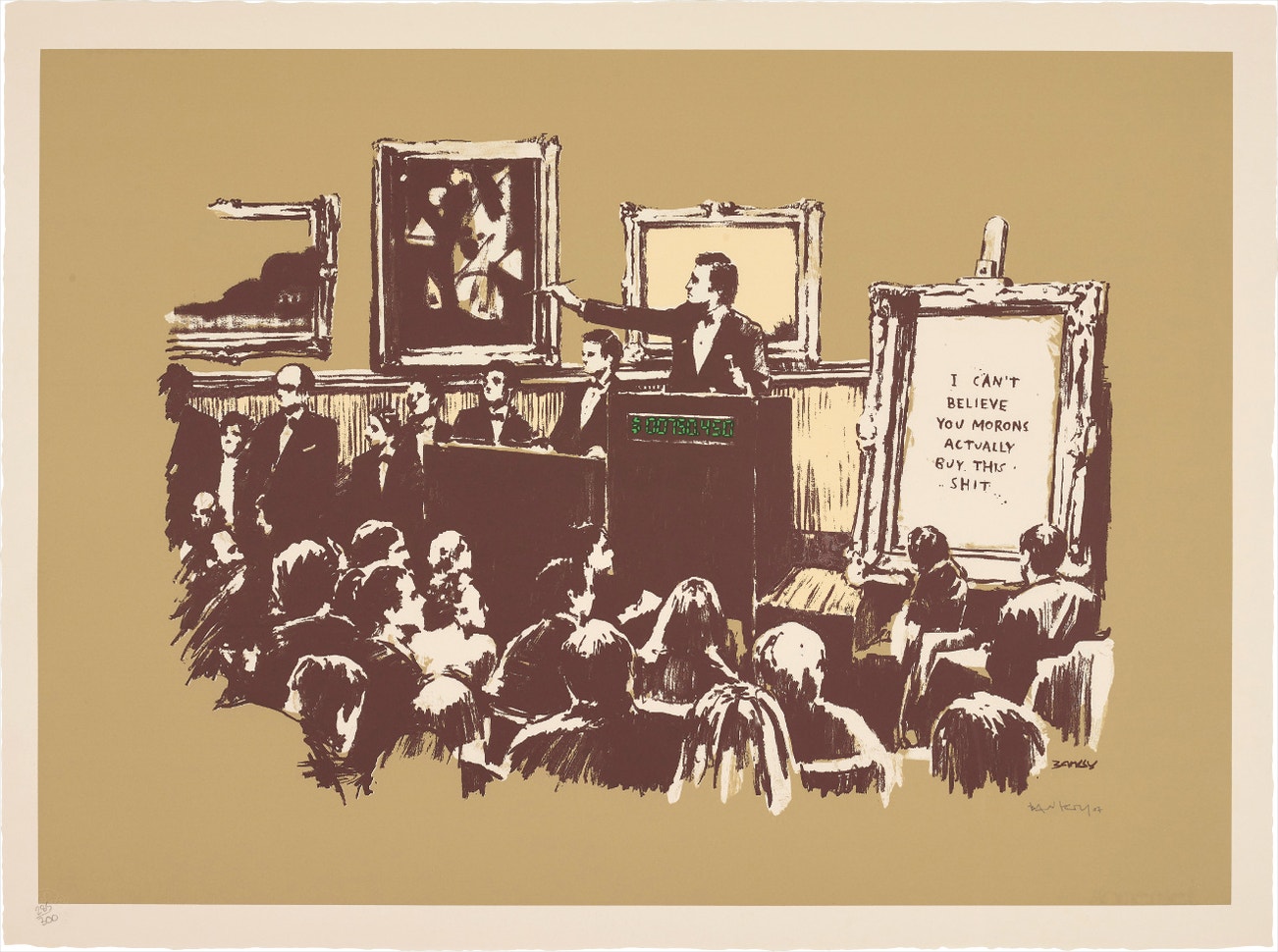His graffiti, paintings and screenprints use whimsy and humour to satirically critique war, capitalism, hypocrisy and greed — with not even the Royal family safe from his anti-establishment wit.