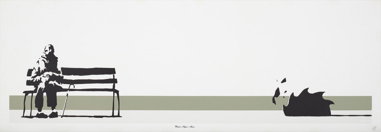His graffiti, paintings and screenprints use whimsy and humour to satirically critique war, capitalism, hypocrisy and greed — with not even the Royal family safe from his anti-establishment wit.