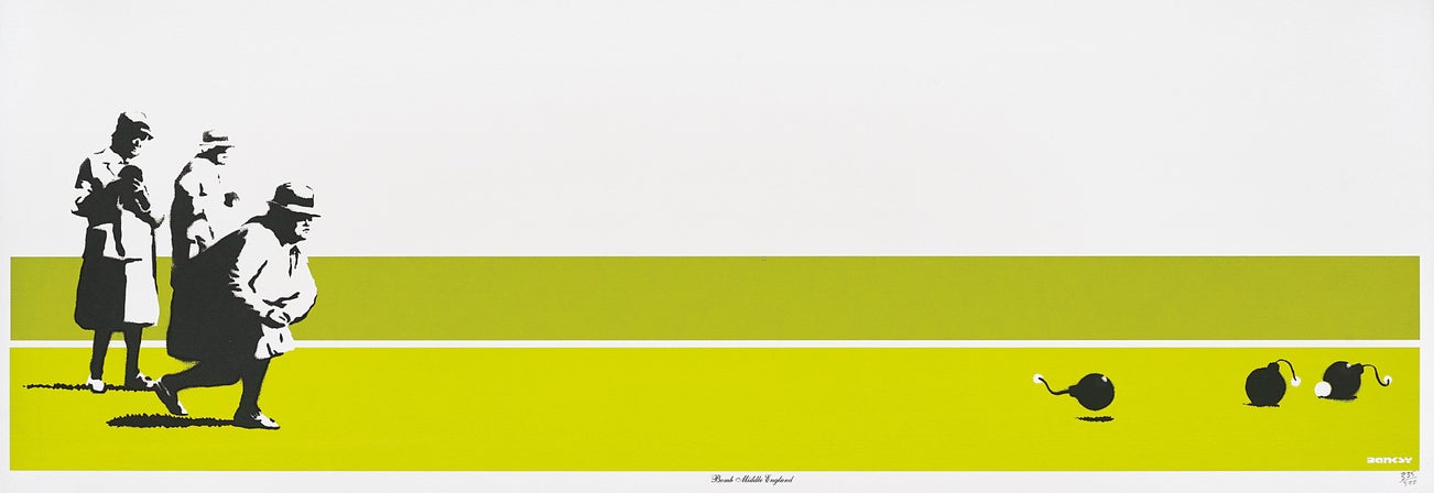 His graffiti, paintings and screenprints use whimsy and humour to satirically critique war, capitalism, hypocrisy and greed — with not even the Royal family safe from his anti-establishment wit.
