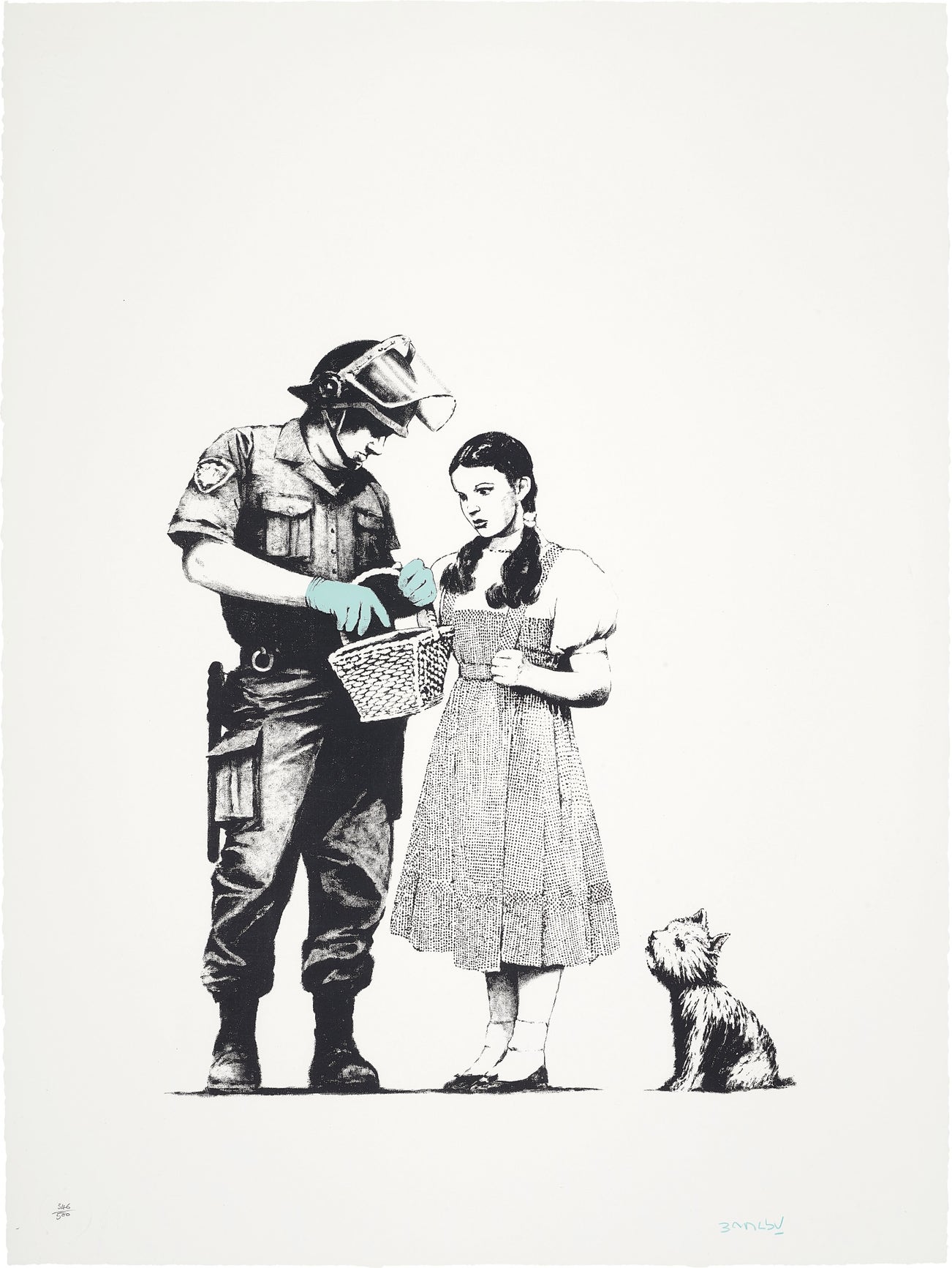 His graffiti, paintings and screenprints use whimsy and humour to satirically critique war, capitalism, hypocrisy and greed — with not even the Royal family safe from his anti-establishment wit.